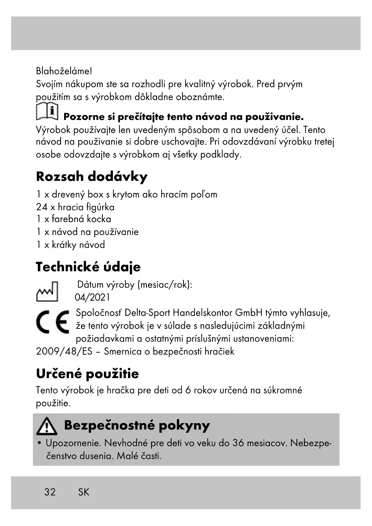 - Vyhráva hráč, ktorému sa týmto spôsobom podarí získať najviac figúrok. Skladovanie, čistenie Pri nepoužívaní skladujte výrobok vždy suchý a čistý pri izbovej teplote. Čistite iba suchou handričkou. DÔLEŽITÉ! Výrobok nikdy nečistite ostrými čistiacimi prostriedkami.34 Pokyny k likvidácii Výrobok a obalový materiál zlikvidujte v súlade s aktuálnymi miestnymi predpismi. Obalový materiál, ako napr. fóliové vrecúško nepatrí do rúk detí. Obalový materiál uschovajte mimo dosahu detí. Výrobky a obaly likvidujte ekologickým spôsobom. Recyklačný kód slúži na označenia rôznych materiálov na navrátenie do obehu opätovného využitia. Kód sa skladá z recyklačného symbolu - ktorý má odzrkadľovať zhodnotenie recyklačnýého obehu - a číslo označujúce materiál. Pokyny k záruke a priebehu servisu Výrobok bol vyrobený veľmi starostlivo a pod stálou kontrolou. Na tento výrobok poskytuje DELTA-SPORT HANDELSKONTOR GmbH súkromným koncovým užívateľom trojročnú záruku odo dňa kúpy (záručná lehota) po splnení nasledovných podmienok. Záruka platí len na chyby mate- riálu a spracovania. Záruka sa netýka dielov, ktoré podliehajú bežnému opotrebeniu a preto ich možno považovať za opotrebiteľné diely (napr. batérie), ako aj krehkých dielov, napr. vypínače, akumulátory alebo diely, ktoré sú vyrobené zo skla. Nároky z tejto záruky zanikajú, keď sa výrobok používal neodborne alebo nesprávne, mimo určenia na používanie alebo určeného rozsahu používania alebo neboli dodržané pokyny návodu na obsluhu, s výnim- kou, že koncový užívateľ preukáže, že ide o chybu materiálu alebo spra- covania, ktorá nebola spôsobená niektorou z hore uvedených okolností. Záruku je možné uplatniť len počas záručnej lehoty po predložení originálu pokladničného dokladu. Originál pokladničného dokladu preto prosím uschovajte. Záručná doba sa kvôli prípadným záručným opravám, zákonnej záruke alebo ako obchodné gesto nepredlžuje. Platí to aj pre vymenené a opravené diely. SK35SK Pri reklamáciách sa prosím najskôr obráťte na dole uvedenú Service- Hotline alebo sa s nami spojte prostredníctvom e-mailu. Ak sa jedná o záručný prípad, výrobok – podľa našej voľby – bezplatne opravíme, vy- meníme alebo vrátime kúpnu cenu. Ďalšie práva zo záruky nevyplývajú. Vaše zákonné práva, hlavne nároky na záručné plnenie voči príslušnému predajcovi, nie sú touto zárukou obmedzené. IAN: 364364_2010 Servis Slovensko Tel.: 0850 232001 E-Mail: deltasport@lidl.sk36 ¡Enhorabuena! Con su compra se ha decidido por un artículo de gran calidad. Famil- iarícese con el artículo antes de usarlo por primera vez. Para ello, lea detenidamente las siguientes instruc- ciones de uso. Use el artículo solo de la forma descrita y para los campos de apli- cación indicados. Conserve estas instrucciones de uso a buen recaudo. Entregue todos los documentos en caso de traspasar el artículo a terceros. Alcance de suministro 1 caja de madera con tapa/tablero de juego 24 fichas 1 dado de colores 1 instrucciones de uso 1 guía rápida Datos técnicos Fecha de fabricación (mes/año): 04/2021 Por la presente, Delta-Sport Handelskontor GmbH declara que este artículo cumple con los siguientes requisitos básicos y las disposiciones pertinentes: 2009/48/CE – Directiva sobre la seguridad de los juguetes Uso previsto Este artículo es un juguete para niños a partir de 6 años de edad para su uso privado. ES37ES Indicaciones de seguridad
