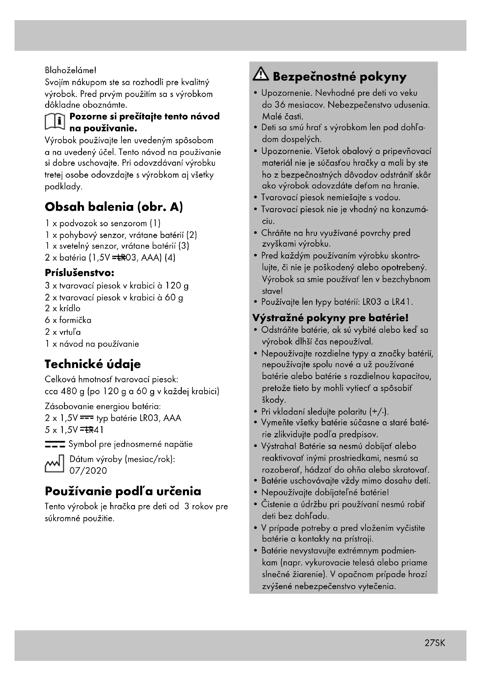 umiestnite na svoje vozidlo. SK29 Upozornenie: Keď sa senzor na vozidle (1) dostane do styku s tvarovacím pieskom, dá sa podvozok do pohybu. Ak sa pohybový sen- zor (2) dostane do styku s tvarovacím pieskom, otočí sa horná časť pohybového senzora. Ak sa svetelný senzor (3) dostane do styku s tvaro- vacím pieskom, rozsvieti a zabliká LED-svetlo v hornej časti svetelného senzora. Funkcia sa po určitom čase automaticky vypne. Skladovanie, čistenie Pri nepoužívaní skladujte výrobok vždy suchý, čistý, bez batérií a pri izbovej teplote. Podvozok, pohybový senzor a svetelný senzor čistite iba suchou handričkou. Z príslušenstva odstráňte prípadne zvyšky tvarovacieho piesku. Tvarovací piesok nikdy nečistite vodou. Tvarovací piesok uschovajte v zatvorených škatuliach. Výrobok chráňte pred horúčavou a priamym slnečným žiarením. DÔLEŽITÉ! Výrobok nikdy nečistite ostrými čistia- cimi prostriedkami. Pokyny k likvidácii V záujme ochrany životného prostredia nevyhadzujte svoj výrobok do domáceho odpadu, ak doslúžil, ale odneste ho na špecializovanú likvidáciu. O zberných miestach a ich otváracích hodinách sa môžete informovať na vašej príslušnej miestnej správe. Chybné alebo použité batérie/akumulátory sa musia recyklovať v súlade so smernicou 2006/66/ES a jej zmenami. Vráťte batérie/ akumulátory a / alebo výrobok prostredníctvom ponúkaných zberných zariadení. Obalové ma- teriály, ako napr. plastové vrecká, nepatria do rúk deťom. Uchovávajte obalový materiál mimo dosahu detí. Škody na životnom prostredí nesprávnou likvidáciou batérií/akumulátorov! Batérie/ akumulátory sa nesmú likvidovať spolu s domovým odpadom. Môžu obsahovať toxické ťažké kovy a podliehajú spracovaniu špeciálne- ho odpadu. Chemické symboly ťažkých kovov sú nasledovné: Cd = kadmium, Hg = ortuť, Pb = olovo. Použité batérie/akumulátory preto odovzdajte v komunálnom zbernom mieste. Výrobok a obal zlikvidujte ekologickým spôsobom. Pri triedení odpadu dodržiavajte označenie obalových materiálov, ktoré sú označené skratkami (a) a číslami (b) s nasledujúcim významom: 1 – 7: plasty/20 – 22: papier a lepenka/80 – 98: kompozitné látky. Výrobok a obalové materiály sú recyklovateľné, likvidujte tieto oddelene pre lepšie spracovanie odpadu. Logo Triman je len pre Francúzsko. Možnosti likvidácie doslúženého výrobku sa dozviete na vašej správe obci alebo mesta. Pokyny k záruke a priebehu servisu Produkt bol vyrobený s maximálnou zodpo- vednosťou a v priebehu výroby bol neustále kontrolovaný. Na tento produkt máte tri roky záruku od dátumu kúpy produktu. Pokladničný lístok si odložte. Záruka sa vzťahuje len na chyby materiálu a výrobné chyby a zaniká pri neodbornej manipulácii s produktom. Záruka nemá vplyv na Vaše zákonné práva, predovšetkým na práva vyplývajúce zo záruky. V prípade reklamácie sa obráťte na nižšie uve- denú servisnú linku, alebo nám napíšte e-mail. Naši servisní zamestnanci sa s Vami dohodnú na ďalšom postupe a urýchlene vykonajú všetky potrebné kroky. V každom prípade Vám poradí- me osobne. Záručná lehota sa nepredlžuje v dôsledku even- tuálnych opráv na základe záruky, zákonného plnenia záruky alebo v dôsledku prejavu ocho- ty. To platí tiež pre vymenené alebo opravené diely. Opravy vykonané po uplynutí záručnej lehoty sú spoplatnené. IAN: 346971_2001 Servis Slovensko Tel.: 0850 232001 E-Mail: deltasport@lidl.sk SK303132