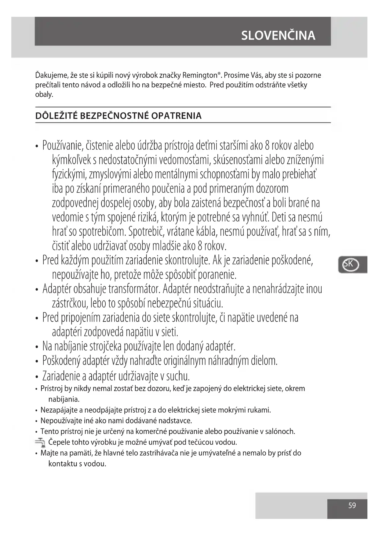 Dakujeme, ze ste si kúpili novy vyrobok značky Remington. Prosime Vás, aby ste si pozorne precítiliarto námod a odložili ho na bezpećné miesto. Pred použitim odstránte vsetky obaly.
