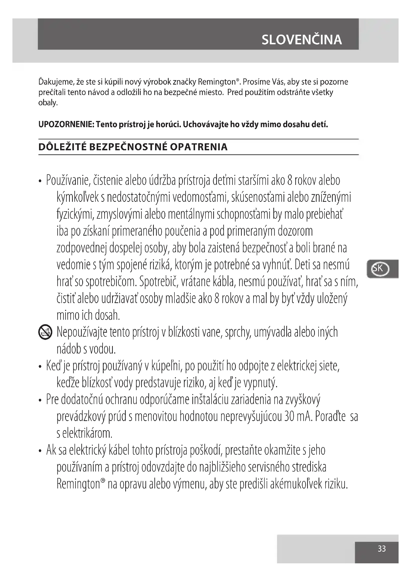 - Ak sa elektrický kábel tohto prístroja poškodí, prestaňte okamžite s jeho používaním a prístroj odovzdajte do najbližšieho servisného strediska Remington® na opravu alebo výmenu, aby ste predišli akémukoľvek riziku.