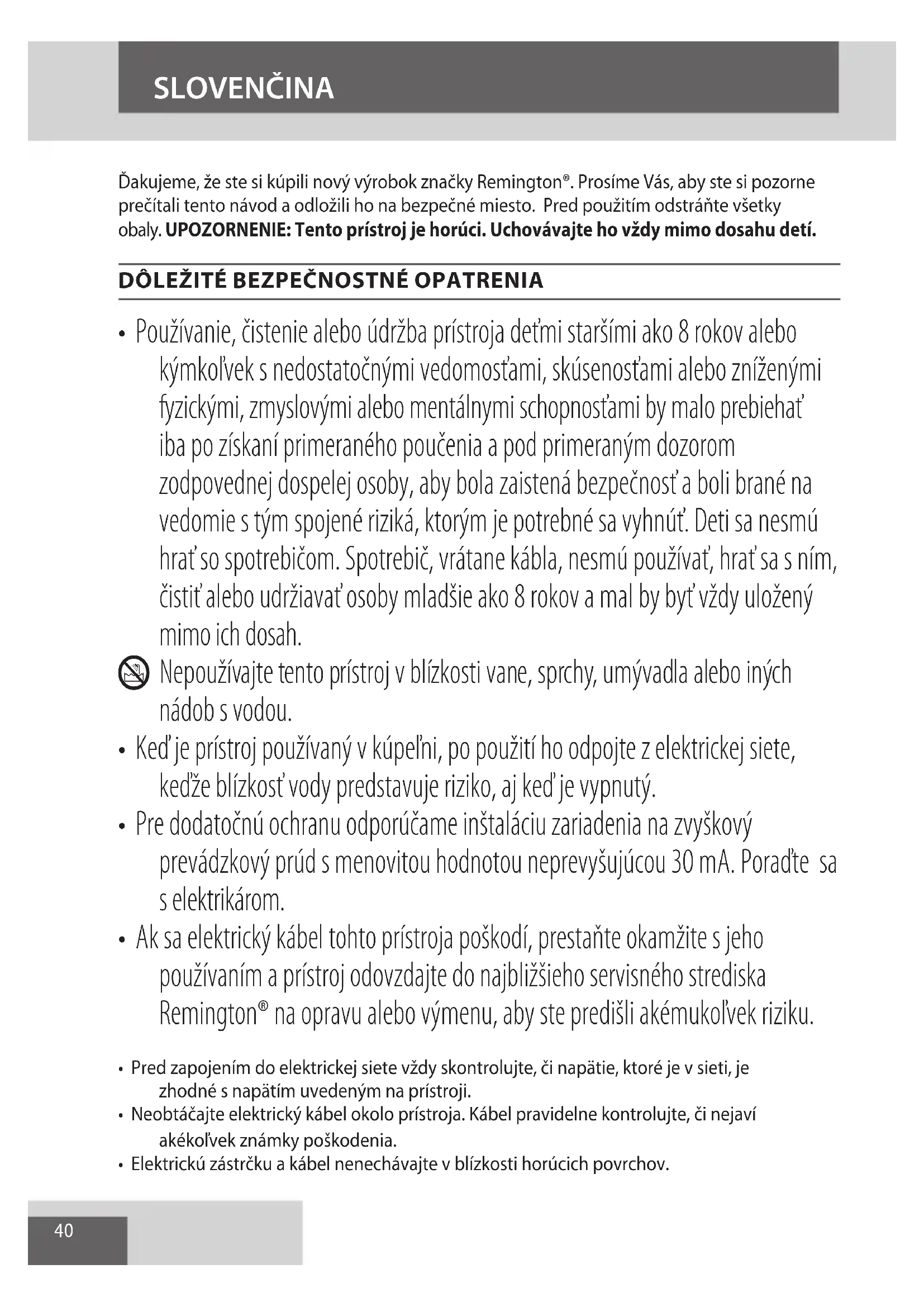 - Ak sa elektrický kábel tohto prístroja poškodí, prestaňte okamžite s jeho používaním a prístroj odovzdajte do najbližšieho servisného strediska Remington® na opravu alebo výmenu, aby ste predišli akémukoľvek riziku.