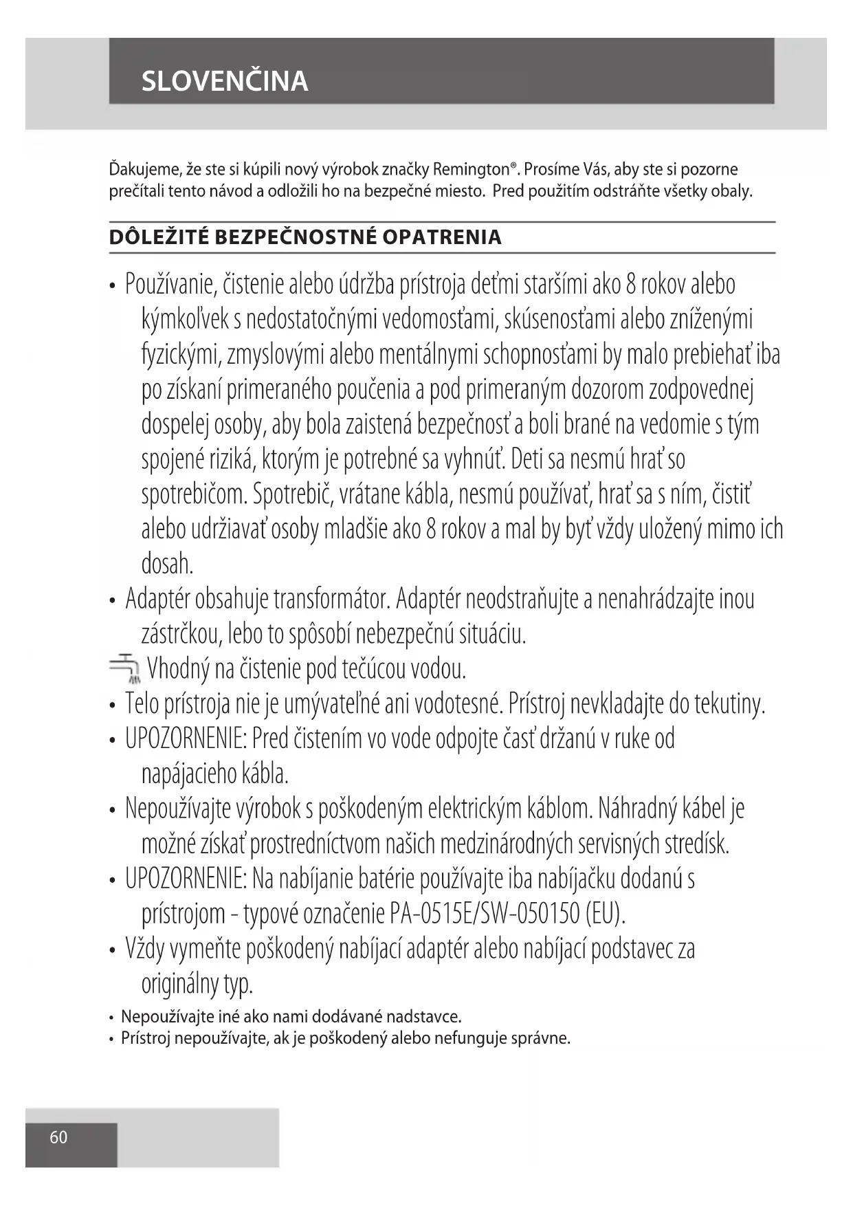 Aby sme sa vyhli environmentálnym a zdravotným problémom vyplývajúcim z nebezpečných látok, prístroje a nabíjateľné a nenabíjateľné batérie označené niektorým z týchto symbolov nesmú byť vyhadzované do netriedeného komunálneho odpadu. Vždy odovzdávajte elektrické a elektronické výrobky a tam, kde je to možné, aj nabíjateľné a nenabíjateľné batérie, na k tomu určených ociálnych recyklačných/zberných miestach.65 Děkujeme, že jste si zakoupili nový výrobek značky Remington®. Přečtěte si prosím pozorně návod a uložte ho na bezpečné místo. Před použitím odstraňte veškeré obaly. DŮLEŽITÁ BEZPEČNOSTNÍ OPATŘENÍ