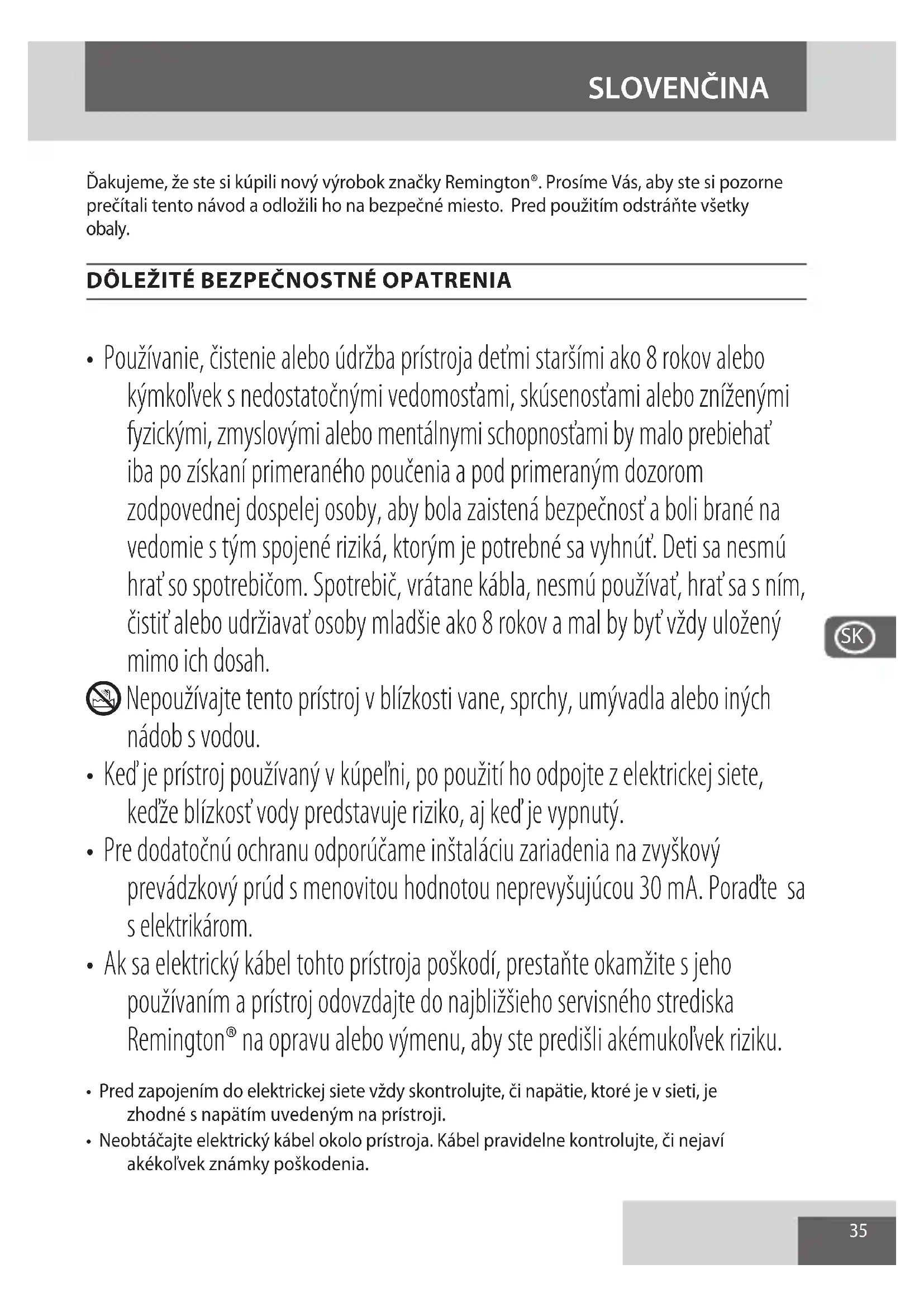 - Ak sa elektrický kábel tohto prístroja poškodí, prestaňte okamžite s jeho používaním a prístroj odovzdajte do najbližšieho servisného strediska Remington® na opravu alebo výmenu, aby ste predišli akémukoľvek riziku.