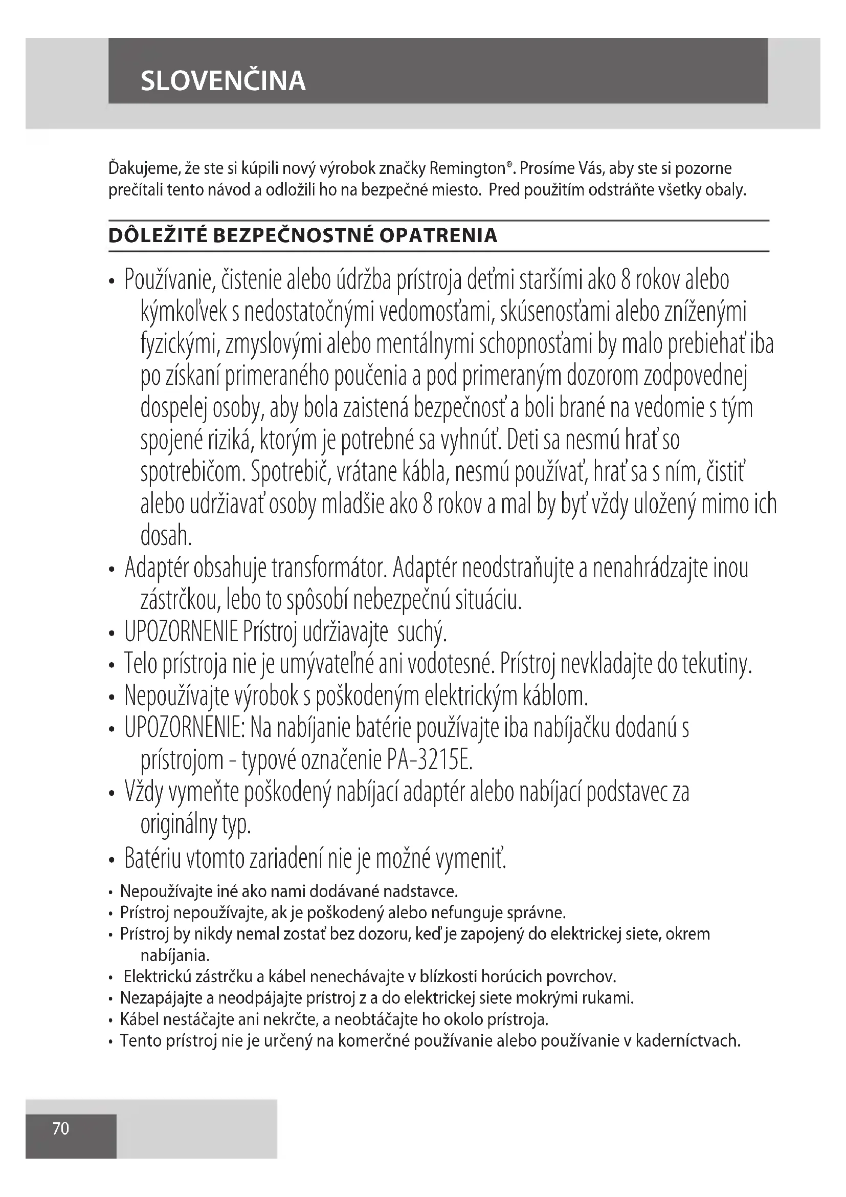 AE70 Ďakujeme, že ste si kúpili nový výrobok značky Remington®. Prosíme Vás, aby ste si pozorne prečítali tento návod a odložili ho na bezpečné miesto. Pred použitím odstráňte všetky obaly.