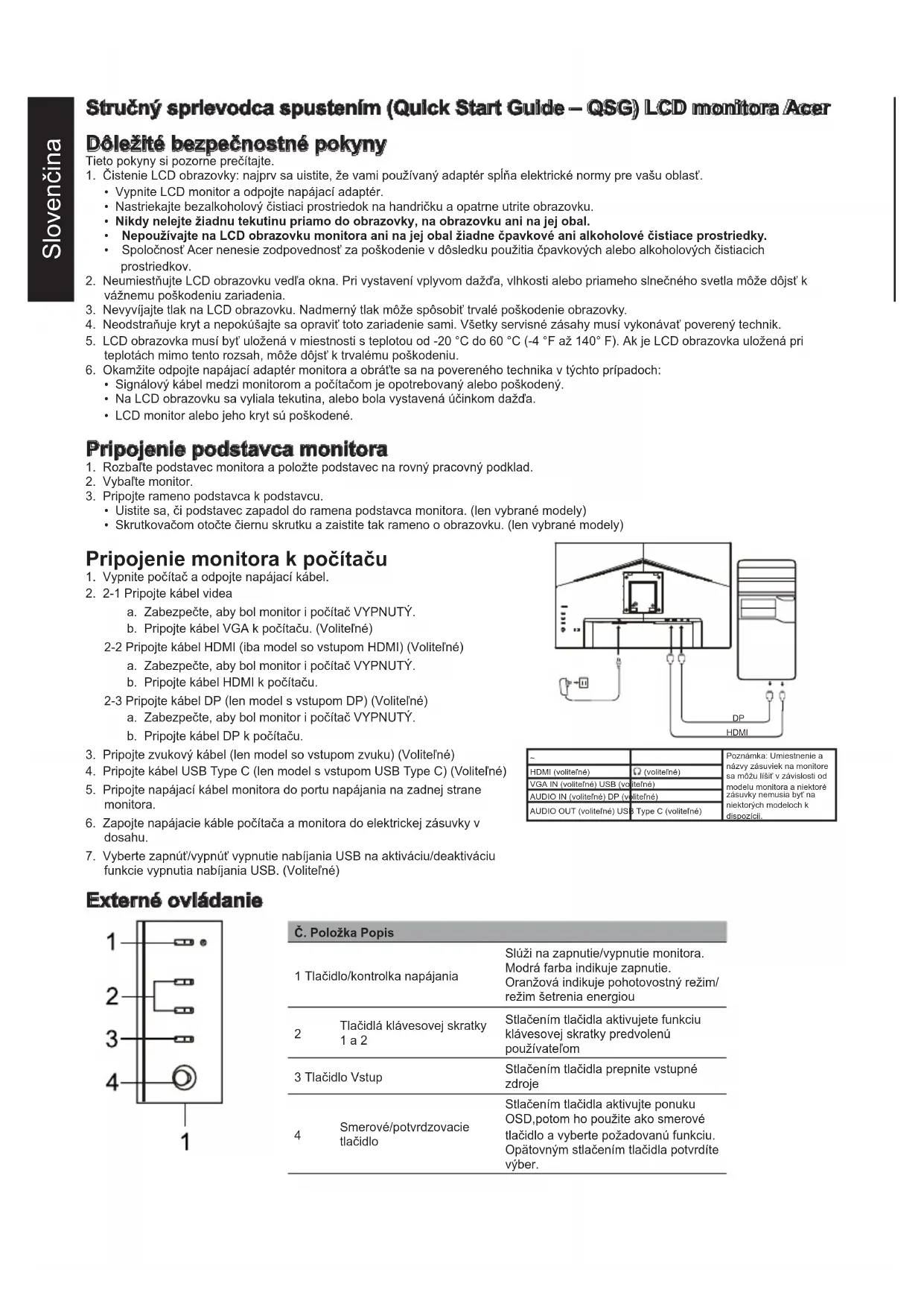 Poznámka: Umiestnenie a názvy zásuviek na monitore sa môžu líšiť v závislosti od modelu monitora a niektoré zásuvky nemusia byť na niektorých modeloch k dispozícii. HDMI (voliteľné) (voliteľné) VGA IN (voliteľné) USB (voliteľné) AUDIO IN (voliteľné) DP (voliteľné) AUDIO OUT (voliteľné) USB Type C (voliteľné) Externé ovládanie Č. Položka Popis 1 Tlačidlo/kontrolka napájania Slúži na zapnutie/vypnutie monitora. Modrá farba indikuje zapnutie. Oranžová indikuje pohotovostný režim/ režim šetrenia energiou