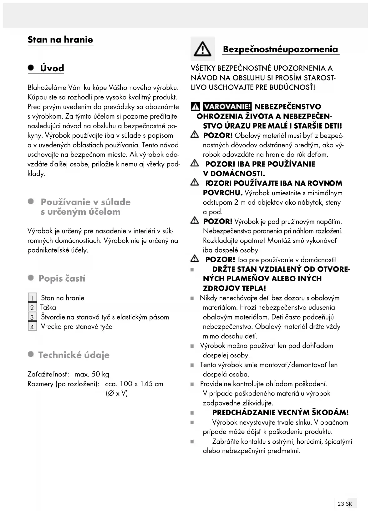 ebezpečenstvo poranenia pri náhlom rozlože ní. Rozkladajte opatrne! Montáž smú vykonávať iba dospelé osoby. POZOR! Iba pre používanie v domácnosti!