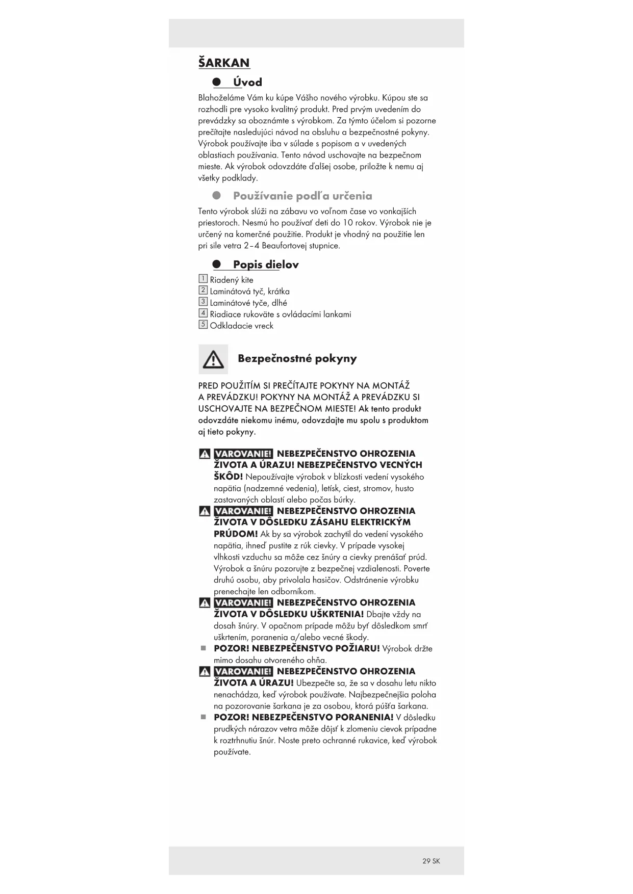 ŽIVOTA A ÚRAZU! Ubezpečte sa, že sa v dosahu letu nikto nenachádza, keď výrobok používate. Najbezpečnejšia poloha na pozorovanie šarkana je za osobou, ktorá púšťa šarkana. POZOR! NEBEZPEČENSTVO PORANENIA! V dôsledku prudkých nárazov vetra môže dôjsť k zlomeniu cievok prípadne k roztrhnutiu šnúr. Noste preto ochranné rukavice, keď výrobok používate.30 SK