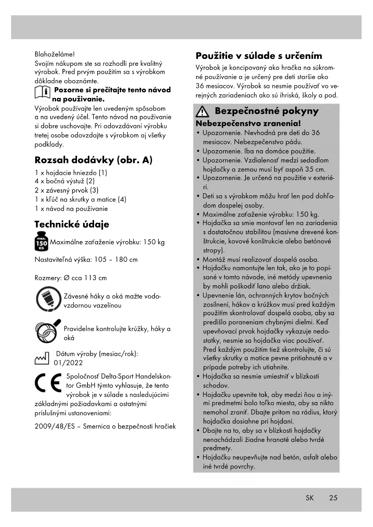 Hojdačku upevnite na zariadenia, na ktorých viete s absolútnou istotou garantovať dostatočnú pevnosť. Pre montáž použite min. 10 mm silné a na trhu bežné háky na hojdačku so zabezpe- čovacou technikou, aby sa zabránilo neúmy- selnému uvoľneniu. V drevenom tráme musí byť upevnenie celkom prestrčené cez drevo a zhora zakontrované, aby sa dosiahol dostatočne bezpečný spoj. Rôzne upevňovacie háky Hojdací prvok upevnite len na vhodných držia- koch. Sú to: Č. 1: zatvorené upevňovacie oká, ktoré sú upev- nené k hojdacím prvkom karabínkou (obr. D). Č. 2: na trhu bežný hák na hojdačku so zabezpečovacou technikou, aby sa zabránilo neúmyselnému uvoľneniu (obr. E). Upozornenie! Oko montážneho krúžku (1) musí byť nasadené priečne k smeru hojdania, aby pri používaní nedochá- dzalo k príliš silnému poškodzovaniu upevňovacieho prvku hojdačky. Nastavenie výšky hojdačky Pomocou krúžku na hornom konci hojdačky sa dá nastaviť výška dosadacej plochy. Ak ste nastavili dĺžku lana, toto lano sa po zaťažení znovu pevne utiahne (obr. F). Dĺžky obidvoch lán nastavte tak, aby bola hojdačka v dokonale vodorovnej polohe. Údržba (obr. G) Pravidelne kontrolujte krúžky, háky a oká výrobku, či sú v bezchybnom stave a opakovane mažte s výrobkom dodané závesné krúžky ako aj Vami poskytnuté závesné háky bežnou vodo- vzdornou vazelínou. Alternatívne môžete použiť mazací tuk na reťaze. SK27 Skladovanie, čistenie Pri nepoužívaní skladujte výrobok vždy suchý a čistý pri izbovej teplote. Čistite iba vodou a následne utrite dosucha čistiacou handričkou. DÔLEŽITÉ! Výrobok nikdy nečistite ostrými čistia- cimi prostriedkami. Pokyny k likvidácii Výrobok a obalový materiál zlikvidujte v súlade s aktuálnymi miestnymi predpismi. Obalový materiál, ako napr. fóliové vrecúško nepatrí do rúk detí. Obalový materiál uschovajte mimo dosahu detí. Výrobky a obaly likvidujte ekologickým spôsobom. Recyklačný kód slúži na označenia rôznych materiálov na navrátenie do obehu opätovného využitia. Kód sa skladá z recyklačného symbolu - ktorý má odzrkadľovať zhodnotenie recyklačnýého obehu - a číslo označujúce materiál. Pokyny k záruke a priebehu servisu Výrobok bol vyrobený veľmi starostlivo a pod stálou kontrolou. Na tento výrobok poskytuje DELTA-SPORT HANDELSKONTOR GmbH súk- romným koncovým užívateľom trojročnú záruku odo dňa kúpy (záručná lehota) po splnení nasle- dovných podmienok. Záruka platí len na chyby materiálu a spracovania. Záruka sa netýka dielov, ktoré podliehajú bežnému opotrebeniu a preto ich možno považovať za opotrebiteľné diely (napr. batérie), ako aj krehkých dielov, napr. vypínače, akumulátory alebo diely, ktoré sú vyrobené zo skla. Nároky z tejto záruky zanikajú, keď sa výrobok používal neodborne alebo nesprávne, mimo určenia na používanie alebo určeného rozsahu používania alebo neboli dodržané pokyny návodu na obsluhu, s výnimkou, že koncový uží- vateľ preukáže, že ide o chybu materiálu alebo spracovania, ktorá nebola spôsobená niektorou z hore uvedených okolností. Záruku je možné uplatniť len počas záručnej lehoty po predložení originálu pokladničného dokladu. Originál pokladničného dokladu preto prosím uschovajte. Záručná doba sa kvôli prípadným záručným opravám, zákonnej záruke alebo ako obchodné gesto nepredlžuje. Platí to aj pre vymenené a opravené diely. Pri reklamáciách sa prosím najskôr obráťte na dole uvedenú Service-Hotline alebo sa s nami spojte prostredníctvom e-mailu. Ak sa jedná o záručný prípad, výrobok – podľa našej voľby – bezplatne opravíme, vymeníme alebo vrátime kúpnu cenu. Ďalšie práva zo záruky nevyplý- vajú. Vaše zákonné práva, hlavne nároky na záručné plnenie voči príslušnému predajcovi, nie sú touto zárukou obmedzené. IAN: 384896_2107 Servis Slovensko Tel.: 0850 232001 E-Mail: deltasport@lidl.sk SK28 ES ¡Enhorabuena! Con su compra se ha decidido por un artículo de gran calidad. Familiarícese con el artículo antes de usarlo por primera vez. Para ello, lea detenidamente las siguientes instrucciones de uso. Use el artículo solo de la forma descrita y para los campos de aplicación indicados. Conserve estas instrucciones de uso a buen recaudo. Entregue todos los documentos en caso de traspasar el artículo a terceros. Contenido de suministro (fig. A) 1 x columpio nido (1) 4 x refuerzo lateral (2) 2 x suspensión (3) 1 x llave fija (4) 1 x instrucciones de uso Datos técnicos Carga máxima del artículo: 150 kg Altura ajustable: 105 - 180 cm Medidas: Ø aprox. 113 cm Engrasar los ganchos y los cáncamos de suspensión con grasa para máquinas resistente al agua Comprobar las anillas, los ganchos y los cáncamos con regularidad Fecha de fabricación (mes/año): 01/2022 Por la presente, Delta-Sport Handels- kontor GmbH declara que este artículo cumple con los siguientes requisitos básicos y las disposiciones pertinentes: 2009/48/CE – Directiva sobre la seguridad de los juguetes Uso conforme al fin previsto El artículo ha sido diseñado como juguete para niños mayores de 36 meses y es de uso privado. El artículo no debe emplearse en instalaciones públicas como parques, escuelas, etc. Indicaciones de seguridad ¡Peligro de lesiones!