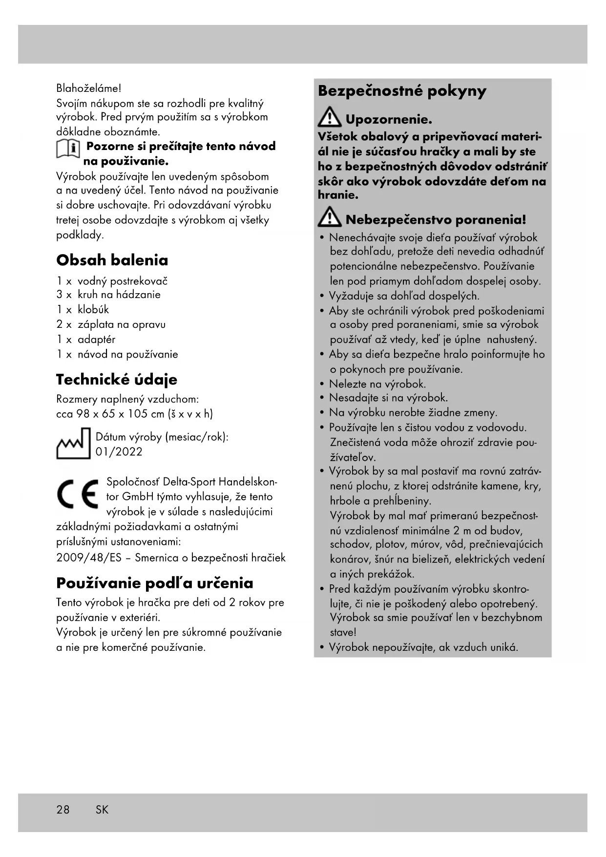 položte ju na poškodené miesto a pevne ju pritlačte. Skladovanie, čistenie Pri nepoužívaní skladujte výrobok vždy nena- hustený, suchý a čistý pri izbovej teplote. Ventily by mali byť pri skladovaní vždy zatvorené. Vý- robok čistite len vodou alebo mydlovou vodou, nikdy ostrými čistiacimi prostriedkami. Pri sklado- vaní na zimu nedávajte na výrobok žiadne ostré predmety a neposýpajte ho mastencom. Pokyny k likvidácii Výrobok a obalový materiál zlikvidujte v súlade s aktuálnymi miestnymi predpismi. Obalový materiál, ako napr. fóliové vrecúško nepatrí do rúk detí. Obalový materiál uschovajte mimo dosahu detí. Výrobky a obaly likvidujte ekologickým spôsobom. Recyklačný kód slúži na označenia rôznych materiálov na navrátenie do obehu opätovného využitia. Kód sa skladá z recyklačného symbolu - ktorý má odzrkadľovať zhodnotenie recyklačnýého obehu - a číslo označujúce materiál. Pokyny k záruke a priebehu servisu Výrobok bol vyrobený veľmi starostlivo a pod stálou kontrolou. Na tento výrobok poskytuje DELTA-SPORT HANDELSKONTOR GmbH súk- romným koncovým užívateľom trojročnú záruku odo dňa kúpy (záručná lehota) po splnení nasle- dovných podmienok. Záruka platí len na chyby materiálu a spracovania. Záruka sa netýka dielov, ktoré podliehajú bežnému opotrebeniu a preto ich možno považovať za opotrebiteľné diely (napr. batérie), ako aj krehkých dielov, napr. vypínače, akumulátory alebo diely, ktoré sú vyrobené zo skla. SK31 Nároky z tejto záruky zanikajú, keď sa výrobok používal neodborne alebo nesprávne, mimo určenia na používanie alebo určeného rozsahu používania alebo neboli dodržané pokyny návodu na obsluhu, s výnimkou, že koncový uží- vateľ preukáže, že ide o chybu materiálu alebo spracovania, ktorá nebola spôsobená niektorou z hore uvedených okolností. Záruku je možné uplatniť len počas záručnej lehoty po predložení originálu pokladničného dokladu. Originál pokladničného dokladu preto prosím uschovajte. Záručná doba sa kvôli prípadným záručným opravám, zákonnej záruke alebo ako obchodné gesto nepredlžuje. Platí to aj pre vymenené a opravené diely. Pri reklamáciách sa prosím najskôr obráťte na dole uvedenú Service-Hotline alebo sa s nami spojte prostredníctvom e-mailu. Ak sa jedná o záručný prípad, výrobok – podľa našej voľby – bezplatne opravíme, vymeníme alebo vrátime kúpnu cenu. Ďalšie práva zo záruky nevyplý- vajú. Vaše zákonné práva, hlavne nároky na záručné plnenie voči príslušnému predajcovi, nie sú touto zárukou obmedzené. IAN: 398788_2107 Servis Slovensko Tel.: 0850 232001 E-Mail: deltasport@lidl.sk SK32 ¡Enhorabuena! Con su compra se ha decidido por un artículo de gran calidad. Familiarícese con el artículo antes de usarlo por primera vez. Para ello, lea detenidamente las siguientes instrucciones de uso. Use el artículo solo de la forma descrita y para los campos de aplicación indicados. Conserve estas instrucciones de uso a buen recaudo. Entregue todos los documentos en caso de traspasar el artículo a terceros. Contenido de suministro 1 x rociador de agua 3 x anillo para lanzar 1 x sombrero 2 x parche de reparación 1 x adaptador 1 x instrucciones de uso Datos técnicos Medidas lleno de aire: aprox. 98 x 65 x 105 cm (An x Al x P) Fecha de fabricación (mes/año): 01/2022 Por la presente, Delta-Sport Handels- kontor GmbH declara que este artículo cumple con los requisitos básicos siguientes y las demás disposiciones pertinentes: 2009/48/CE – Directiva sobre la seguridad de los juguetes Uso conforme al fin previsto Este artículo es un juguete de uso en exteriores para niños a partir de 2 años. El artículo ha sido diseñado únicamente para el uso privado, no siendo apto para el uso comercial. Instrucciones de seguridad Advertencia. Los materiales de embalaje y fijación no forman parte del juguete y deben ser siempre retirados por motivos de seguridad antes de entregar el artículo a los niños para jugar. ¡Peligro de lesiones!