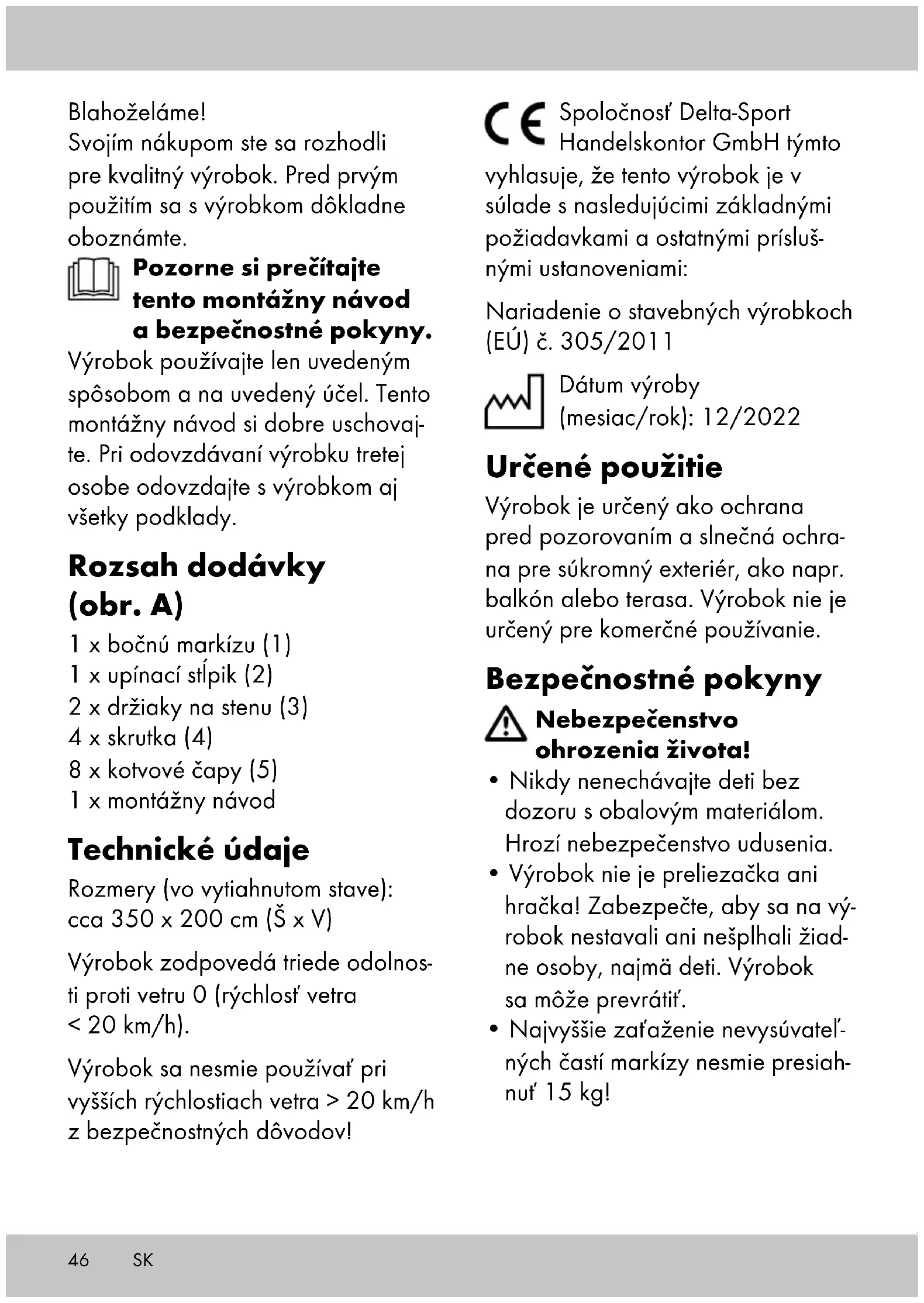 - Pri extrémnych poveternostných podmienkach, napr. pri silnom vetre, výrobok zaistite. Výrobok skladujte v chránených priestoroch.