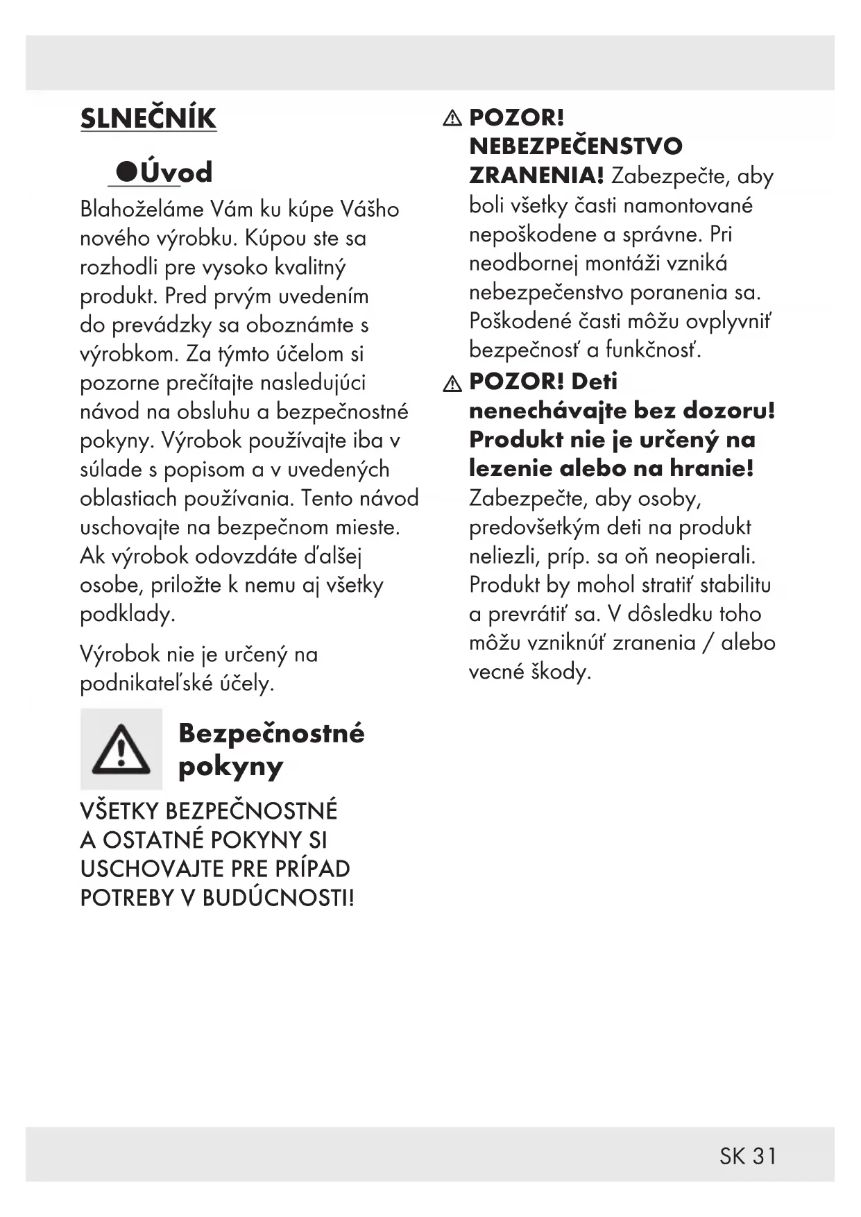 POZOR! Deti nenechávajte bez dozoru! Produkt nie je určený na lezenie alebo na hranie! Zabezpečte, aby osoby, predovšetkým deti na produkt neliezli, príp. sa oň neopierali. Produkt by mohol stratiť stabilitu a prevrátiť sa. V dôsledku toho môžu vzniknúť zranenia / alebo vecné škody.32