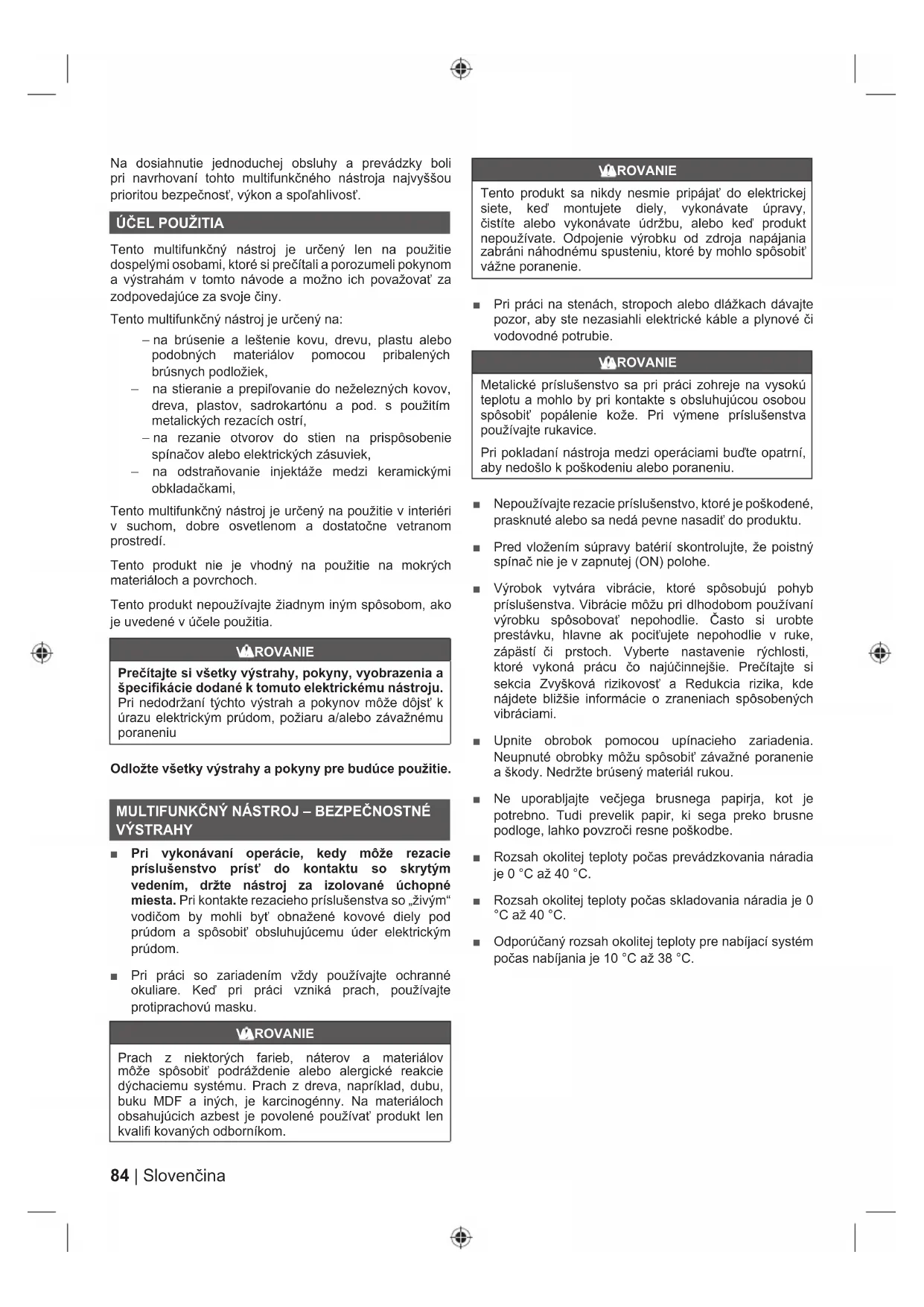 Tento multifunkčný nástroj je určený len na použitie dospelými osobami, ktoré si prečítali a porozumeli pokynom a výstrahám v tomto návode a možno ich považovať za zodpovedajúce za svoje činy. Tento multifunkčný nástroj je určený na: – na brúsenie a leštenie kovu, drevu, plastu alebo podobných materiálov pomocou pribalených brúsnych podložiek, – na stieranie a prepiľovanie do neželezných kovov, dreva, plastov, sadrokartónu a pod. s použitím metalických rezacích ostrí, – na rezanie otvorov do stien na prispôsobenie spínačov alebo elektrických zásuviek, – na odstraňovanie injektáže medzi keramickými obkladačkami, Tento multifunkčný nástroj je určený na použitie v interiéri v suchom, dobre osvetlenom a dostatočne vetranom prostredí. Tento produkt nie je vhodný na použitie na mokrých materiáloch a povrchoch. Tento produkt nepoužívajte žiadnym iným spôsobom, ako je uvedené v účele použitia. VAROVANIE Prečítajte si všetky výstrahy, pokyny, vyobrazenia a špecifikácie dodané k tomuto elektrickému nástroju. Pri nedodržaní týchto výstrah a pokynov môže dôjsť k úrazu elektrickým prúdom, požiaru a/alebo závažnému poraneniu Odložte všetky výstrahy a pokyny pre budúce použitie.