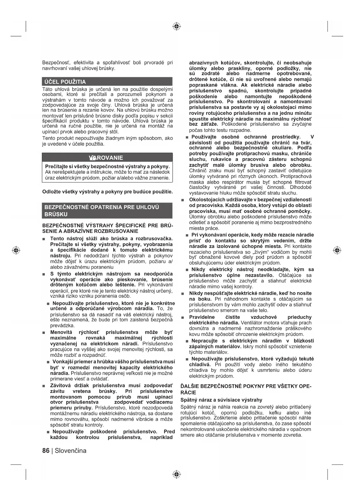 Táto uhlová brúska je určená len na použitie dospelými osobami, ktoré si prečítali a porozumeli pokynom a výstrahám v tomto návode a možno ich považovať za zodpovedajúce za svoje činy. Uhlová brúska je určená len na brúsenie a rezanie kovov. Na uhlovú brúsku možno montovať len príslušné brúsne disky podľa popisu v sekcii špecifikácií produktu v tomto návode. Uhlová brúska je určená na ručné použitie, nie je určená na montáž na upínací prvok alebo pracovný stôl. Tento produkt nepoužívajte žiadnym iným spôsobom, ako je uvedené v účele použitia. VAROVANIE Prečítajte si všetky bezpečnostné výstrahy a pokyny. Ak nerešpektujete a inštrukcie, môže to mať za následok úraz elektrickým prúdom, požiar a/alebo vážne zranenie. Odložte všetky výstrahy a pokyny pre budúce použitie.