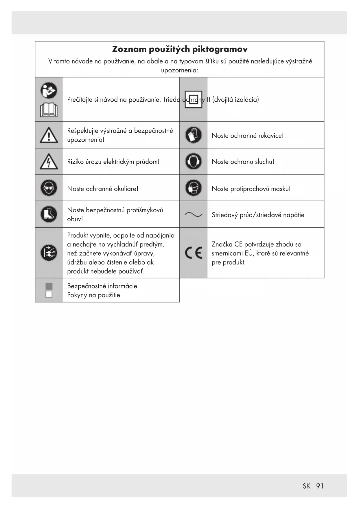 Produkt vypnite, odpojte od napájania a nechajte ho vychladnúť predtým, než začnete vykonávať úpravy, údržbu alebo čistenie alebo ak produkt nebudete používať. Značka CE potvrdzuje zhodu so smernicami EÚ, ktoré sú relevantné pre produkt. Bezpečnostné informácie Pokyny na použitie92 SK