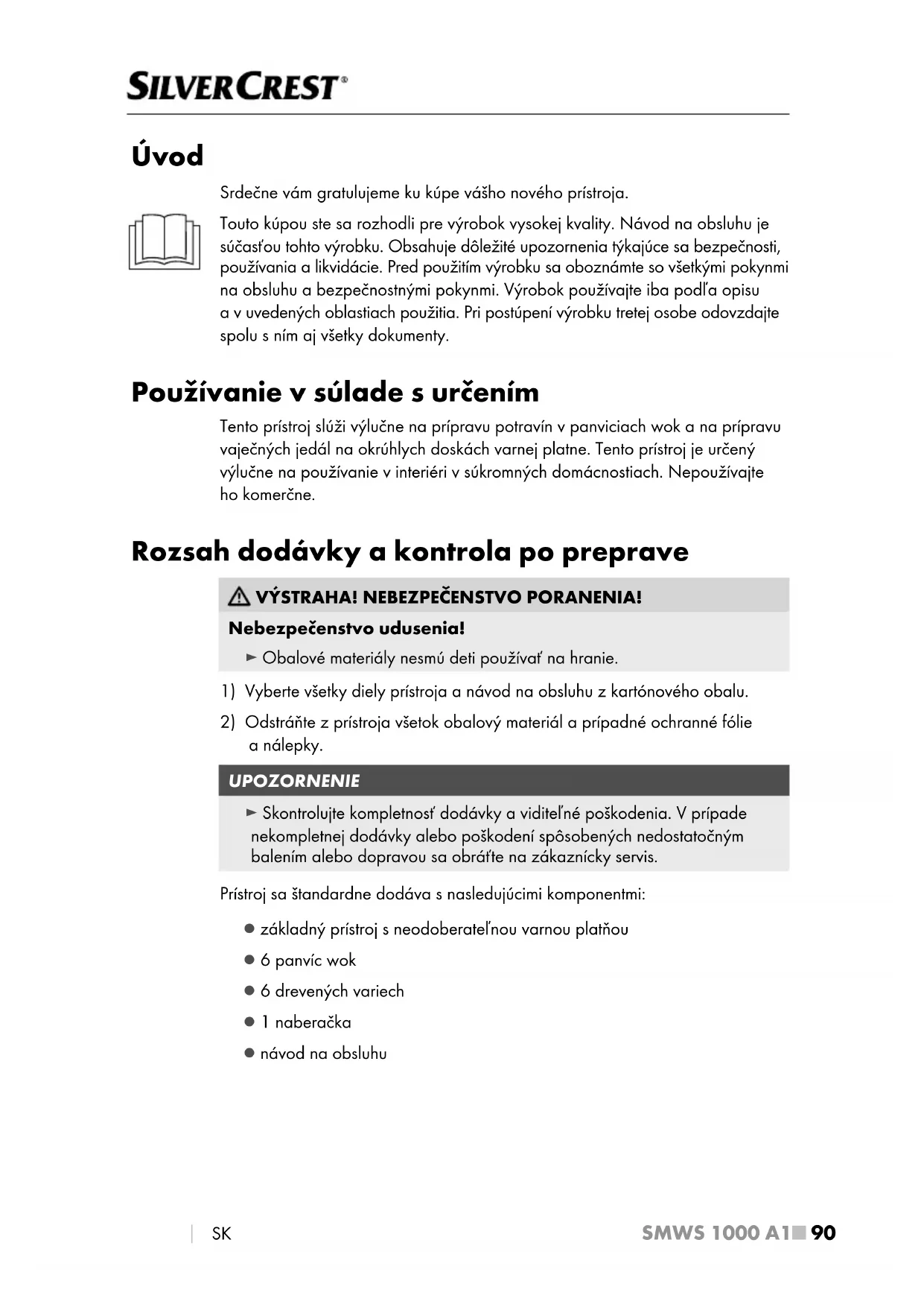 SK Úvod Srdečne vám gratulujeme ku kúpe vášho nového prístroja. Touto kúpou ste sa rozhodli pre výrobok vysokej kvality. Návod naobsluhu je súčasťou tohto výrobku. Obsahuje dôležité upozornenia týkajúce sa bezpečnosti, používania a likvidácie. Pred použitím výrobku sa oboznámte sovšetkými pokynmi na obsluhu a bezpečnostnými pokynmi. Výrobok používajte iba podľa opisu a vuvedených oblastiach použitia. Pri postúpení výrobku tretej osobe odovzdajte spolu sním aj všetky dokumenty. Používanie vsúlade surčením Tento prístroj slúži výlučne na prípravu potravín v panviciach wok a na prípravu vaječných jedál na okrúhlych doskách varnej platne. Tento prístroj je určený výlučne na používanie v interiéri v súkromnýchdomácnostiach. Nepoužívajte ho komerčne. Rozsah dodávky akontrola po preprave VÝSTRAHA! NEBEZPEČENSTVO PORANENIA! Nebezpečenstvo udusenia! ► Obalové materiály nesmú deti používať na hranie.