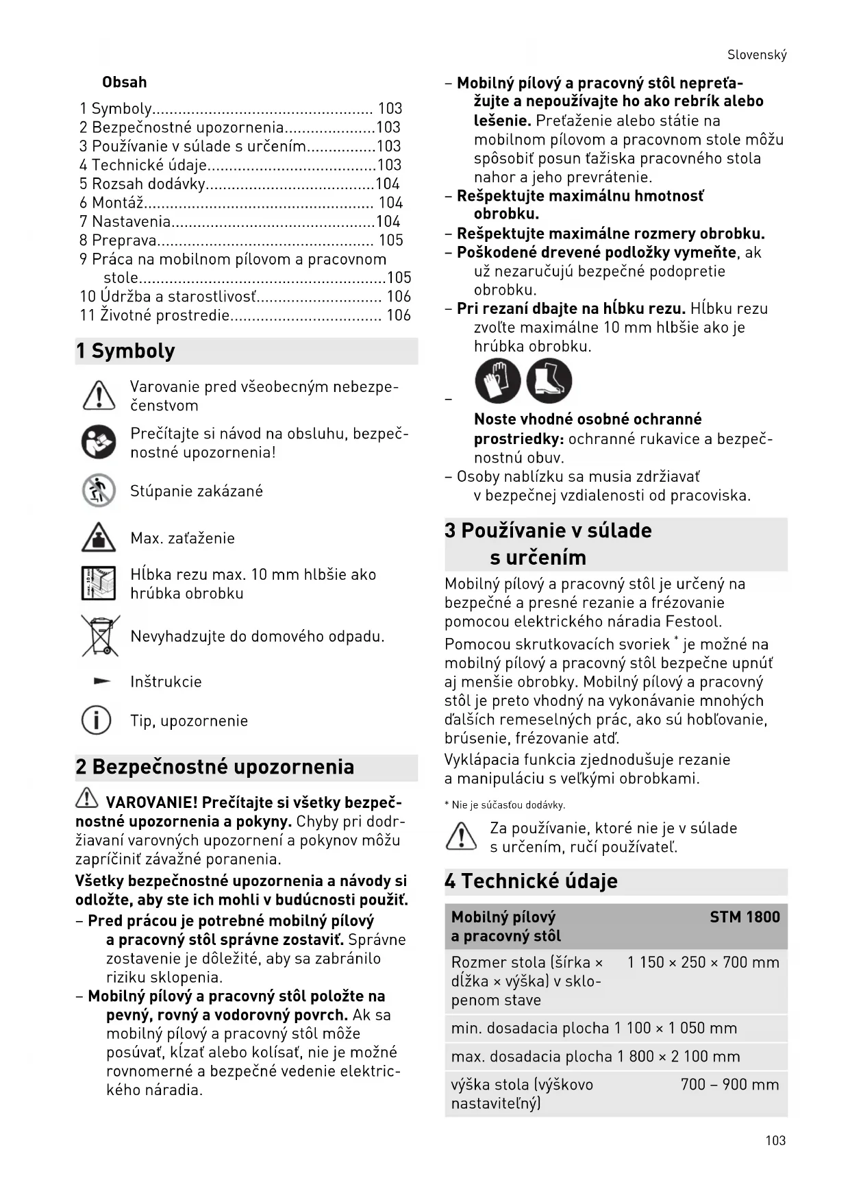 - 11 Životné prostredie 1 Symboly Varovanie pred všeobecným nebezpe čenstvom Prečítajte si návod na obsluhu, bezpeč nostné upozornenia! Stúpanie zakázané Max. zaťaženie max. 10 mm Hĺbka rezu max. 10 mm hlbšie ako hrúbka obrobku Nevyhadzujte do domového odpadu. Inštrukcie Tip, upozornenie 2 Bezpečnostné upozornenia VAROVANIE! Prečítajte si všetky bezpeč nostné upozornenia a pokyny. Chyby pri dodr žiavaní varovných upozornení a pokynov môžu zapríčiniť závažné poranenia. Všetky bezpečnostné upozornenia a návody si odložte, aby ste ich mohli v budúcnosti použiť. – Pred prácou je potrebné mobilný pílový a pracovný stôl správne zostaviť. Správne zostavenie je dôležité, aby sa zabránilo riziku sklopenia. – Mobilný pílový a pracovný stôl položte na pevný, rovný a vodorovný povrch. Ak sa mobilný pílový a pracovný stôl môže posúvať, kĺzať alebo kolísať, nie je možné rovnomerné a bezpečné vedenie elektric kého náradia. – Mobilný pílový a pracovný stôl nepreťa žujte a nepoužívajte ho ako rebrík alebo lešenie. Preťaženie alebo státie na mobilnom pílovom a pracovnom stole môžu spôsobiť posun ťažiska pracovného stola nahor a jeho prevrátenie. – Rešpektujte maximálnu hmotnosť obrobku. – Rešpektujte maximálne rozmery obrobku. – Poškodené drevené podložky vymeňte, ak už nezaručujú bezpečné podopretie obrobku. – Pri rezaní dbajte na hĺbku rezu. Hĺbku rezu zvoľte maximálne 10 mm hlbšie ako je hrúbka obrobku. p. 106