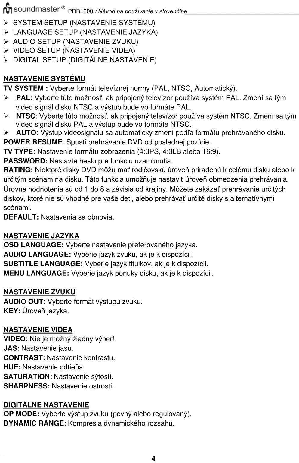 Ak chcete prejsť do ponuky nastavenia, v režime DVD stlačte tlačidlo „SETUP“. Pomocou kurzorových tlačidiel vyberte požadovanú položku. Po dokončení nastavení stlačte znova tlačidlo „SETUP“, aby ste sa vrátili do normálneho zobrazenia. Je možné zmeniť nasledujúce položky ponuky:PDB1600 / Návod na používanie v slovenčine