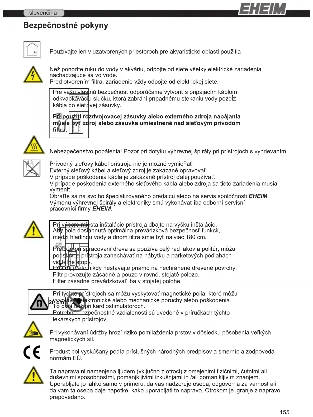 pro jsou naplněné v síťkách. Dlouhodobá ltrační média se nikdy neplní do sítěných sáčků nebo nylonových punčoch. To vede v krátké době k extrémnímu poklesu výkonu čerpadla. ...Vzduch ve ltru Příčina Odstranění Chybí napájení ze sítě Zapojte zástrčku do sítě Zlomená osa Vyměňte osu (viz seznam náhradních dílů) Chybí rotor čerpadla resp. je zablokovaný kamínkem, ulitou apod. Namontujte rotor čerpadla, vyčistěte komoru čerpadla ...Čerpadlo neběží slovenčina Dakujeme, že ste si kúpili nový vonkajší lter pre akvária EHEIM generácia High-Tech EHEIM professionel 3. Tento inovačný systém je vďaka novo vyvinutému pomocnému nasávaciemu zariadeniu, funkčne vyhovujúcemu bezpečnostnému adaptéru a vizuálnej kontrole prietoku veľmi komfortný a maximál- ne bezpečný. Veľký objem nádrže, veľký horný predradený lter v spojení so zladenou štruktúrou ltračnej hmoty pri tom zabezpečujú optimálne čistenie vody, vysoko účinné odbúravanie škodlivín, a tým dobrý zdravotný stav obyvateľov Vášho akvária. Praktická obsluha je veľmi jednoduchá a pohodlná. Všetko, čo potrebujete vedieť o prvej inštalácii, starostlivosti a údržbe, nájdete v tomto podrobnom návode na obsluhu.155 slovenčina Používajte len v uzatvorených priestoroch pre akvaristické oblasti použitia Než ponoríte ruku do vody v akváriu, odpojte od siete všetky elektrické zariadenia nachádzajúce sa vo vode. Pred otvorením ltra, zariadenie vždy odpojte od elektrickej siete. Pre vašu vlastnú bezpečnosť odporúčame vytvoriť s pripájacím káblom odkvapkávaciu slučku, ktorá zabráni prípadnému stekaniu vody pozdĺž kábla do sieťovej zásuvky. Pri použití rozdvojovacej zásuvky alebo externého zdroja napájania musia byť zdroj alebo zásuvka umiestnené nad sieťovým prívodom ltra. Nebezpečenstvo popálenia! Pozor pri dotyku výhrevnej špirály pri prístrojoch s vyhrievaním. Prívodný sieťový kábel prístroja nie je možné vymieňať. Externý sieťový kábel a sieťový zdroj je zakázané opravovať. V prípade poškodenia kábla je zakázané prístroj ďalej používať. V prípade poškodenia externého sieťového kábla alebo zdroja sa tieto zariadenia musia vymeniť. Obráťte sa na svojho špecializovaného predajcu alebo na servis spoločnosti EHEIM. Výmenu výhrevnej špirály a elektroniky smú vykonávať iba odborní servisní pracovníci rmy EHEIM. Pri výbere miesta inštalácie prístroja dbajte na výšku inštalácie. Aby bola dosiahnutá optimálna prevádzková bezpečnosť funkcií, medzi hladinou vody a dnom ltra smie byť najviac 180 cm. Pretože pri spracovaní dreva sa používa celý rad lakov a politúr, môžu podstavce prístroja zanechávať na nábytku a parketových podlahách viditeľné stopy. Prístroj preto nikdy nestavajte priamo na nechránené drevené povrchy. Filtr provozujte zásadně a pouze v rovné, stojaté poloze. Filter zásadne prevádzkovať iba v stojatej polohe. Pri týchto prístrojoch sa môžu vyskytovať magnetické polia, ktoré môžu vyvolávať elektronické alebo mechanické poruchy alebo poškodenia. To platí tiež pri kardiostimulátoroch. Potrebné bezpečnostné vzdialenosti sú uvedené v príručkách týchto lekárskych prístrojov. Pri vykonávaní údržby hrozí riziko pomliaždenia prstov v dôsledku pôsobenia veľkých magnetických síl. Produkt bol vyskúšaný podľa príslušných národných predpisov a smerníc a zodpovedá normám EÚ. Ta naprava ni namenjena ljudem (vključno z otroci) z omejenimi zičnimi, čutnimi ali duševnimi sposobnostmi, pomanjkljivimi izkušnjami in /ali pomanjkljivim znanjem. Uporabljate jo lahko samo v primeru, da vas nadzoruje oseba, odgovorna za varnost ali da vam ta oseba daje napotke, kako uporabljati to napravo. Otrokom je igranje z napravo prepovedano. Bezpečnostné pokyny 20 cm156 slovenčina Naprave ali njenih delov ne čistite v pomivalnem stroju. Ni obstojno v pomivalnem stroju! Ta proizvod ne zavrzite skupaj z običajnimi gospodinjskimi odpadki. Odnesite ga na lokalno zbirališče. Vonkajší lter pre akvária 2080 Vyhotovenie: Viď typový štítok na hornej časti ltra Technické zmeny vyhradené. Obsah Strana Denícia pojmov, jednotlivé súcasti / rozsah dodávky 156 Inštalácia hadice 157 Inštalácia ltra 157 Plnenie ltracných hmôt 158-159 Uvedeniu ltra do chodu 159 Údržba a starostlivost 159-161 Co robit, ked... 161-163 Všeobecný popis funkcie Vonkajší lter pre akvária EHEIM professionel 3 čistí akváriovú vodu v uzatvorenom cirkulačnom okruhu. Dve nasávacie vedenia umožňujú individuálnu voľbu oblastí odsávania v akváriu. Zabudované bezúdržbové čerpadlo pri tom zaisťuje permanentnú cirkuláciu: Voda je z akvária vedená rôznymi ltračnými vrstvami, kde dochádza k jej mechanickej, biologickej alebo adsorpčnej ltrácii, a následne tečie späť do akvária. Pre správnu funkciu ltra je nutné, aby bol po spustení vypustený vzduch zo systému, čo ľahko vykonáte pomocou zabudovaného pomocného nasávacieho zariadenia. Upozornenie: Optimálny výkon ltra a bezporuchovú funkciu dosiahnete iba pri používaní originálnych ltracných hmôt EHEIM (vid kapitolu „Plnenie ltracných hmôt“). Denícia pojmov, jednotlivé súčasti / rozsah dodávky
