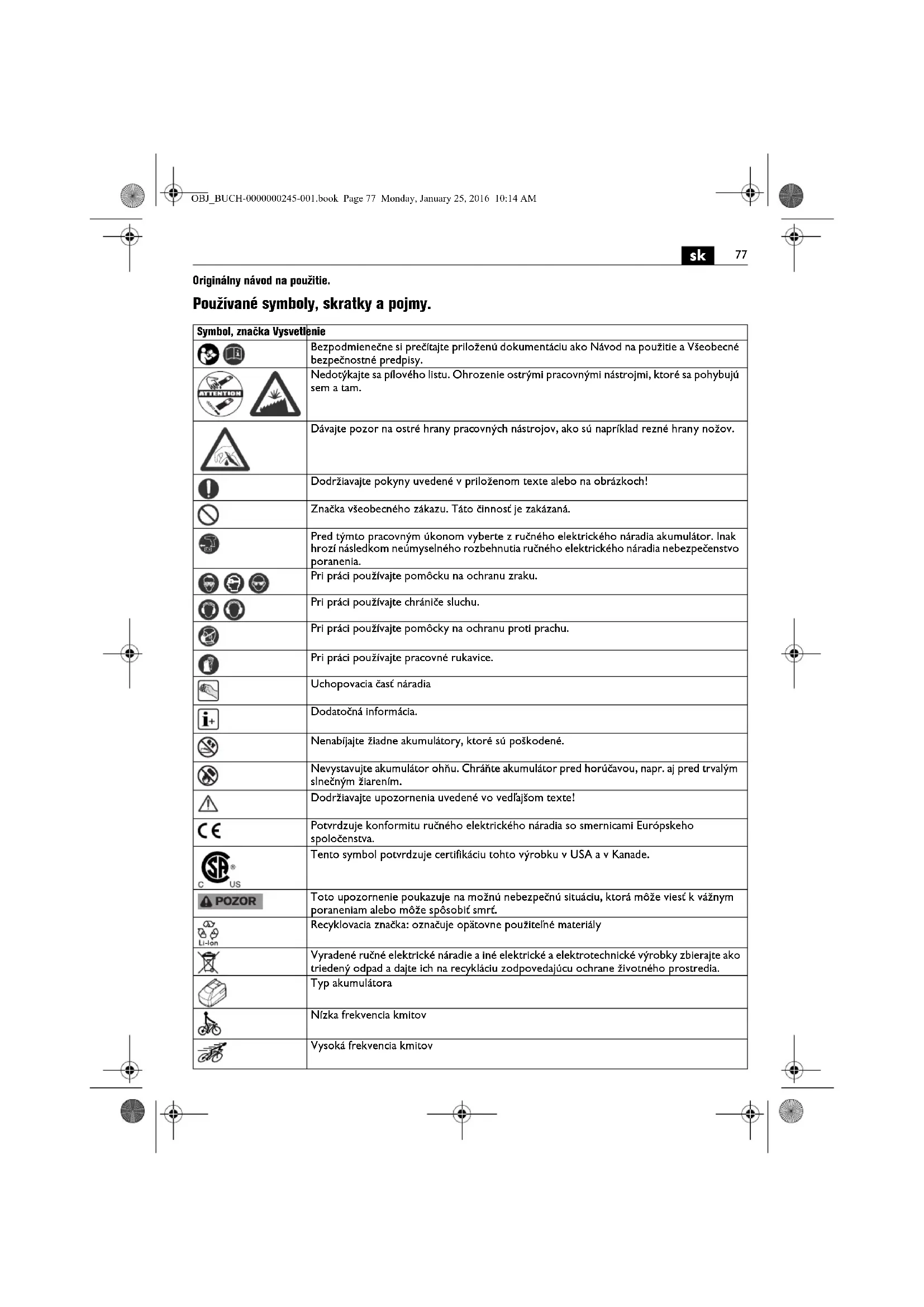 Originálny návod na použitie. Používané symboly, skratky a pojmy. Symbol, značka Vysvetlenie Bezpodmienečne si prečítajte priloženú dokumentáciu ako Návod na použitie a Všeobecné bezpečnostné predpisy. Nedotýkajte sa pílového listu. Ohrozenie ostrými pracovnými nástrojmi, ktoré sa pohybujú sem a tam. Dávajte pozor na ostré hrany pracovných nástrojov, ako sú napríklad rezné hrany nožov. Dodržiavajte pokyny uvedené v priloženom texte alebo na obrázkoch! Značka všeobecného zákazu. Táto činnosť je zakázaná. Pred týmto pracovným úkonom vyberte z ručného elektrického náradia akumulátor. Inak hrozí následkom neúmyselného rozbehnutia ručného elektrického náradia nebezpečenstvo poranenia. Pri práci používajte pomôcku na ochranu zraku. Pri práci používajte chrániče sluchu. Pri práci používajte pomôcky na ochranu proti prachu. Pri práci používajte pracovné rukavice. Uchopovacia časť náradia Dodatočná informácia. Nenabíjajte žiadne akumulátory, ktoré sú poškodené. Nevystavujte akumulátor ohňu. Chráňte akumulátor pred horúčavou, napr. aj pred trvalým slnečným žiarením. Dodržiavajte upozornenia uvedené vo vedľajšom texte! Potvrdzuje konformitu ručného elektrického náradia so smernicami Európskeho spoločenstva. Tento symbol potvrdzuje certifikáciu tohto výrobku v USA a v Kanade. Toto upozornenie poukazuje na možnú nebezpečnú situáciu, ktorá môže viesť k vážnym poraneniam alebo môže spôsobiť smrť. Recyklovacia značka: označuje opätovne použiteľné materiály Vyradené ručné elektrické náradie a iné elektrické a elektrotechnické výrobky zbierajte ako triedený odpad a dajte ich na recykláciu zodpovedajúcu ochrane životného prostredia. Typ akumulátora Nízka frekvencia kmitov Vysoká frekvencia kmitov OBJ_BUCH-0000000245-001.book Page 77 Monday, January 25, 2016 10:14 AM78