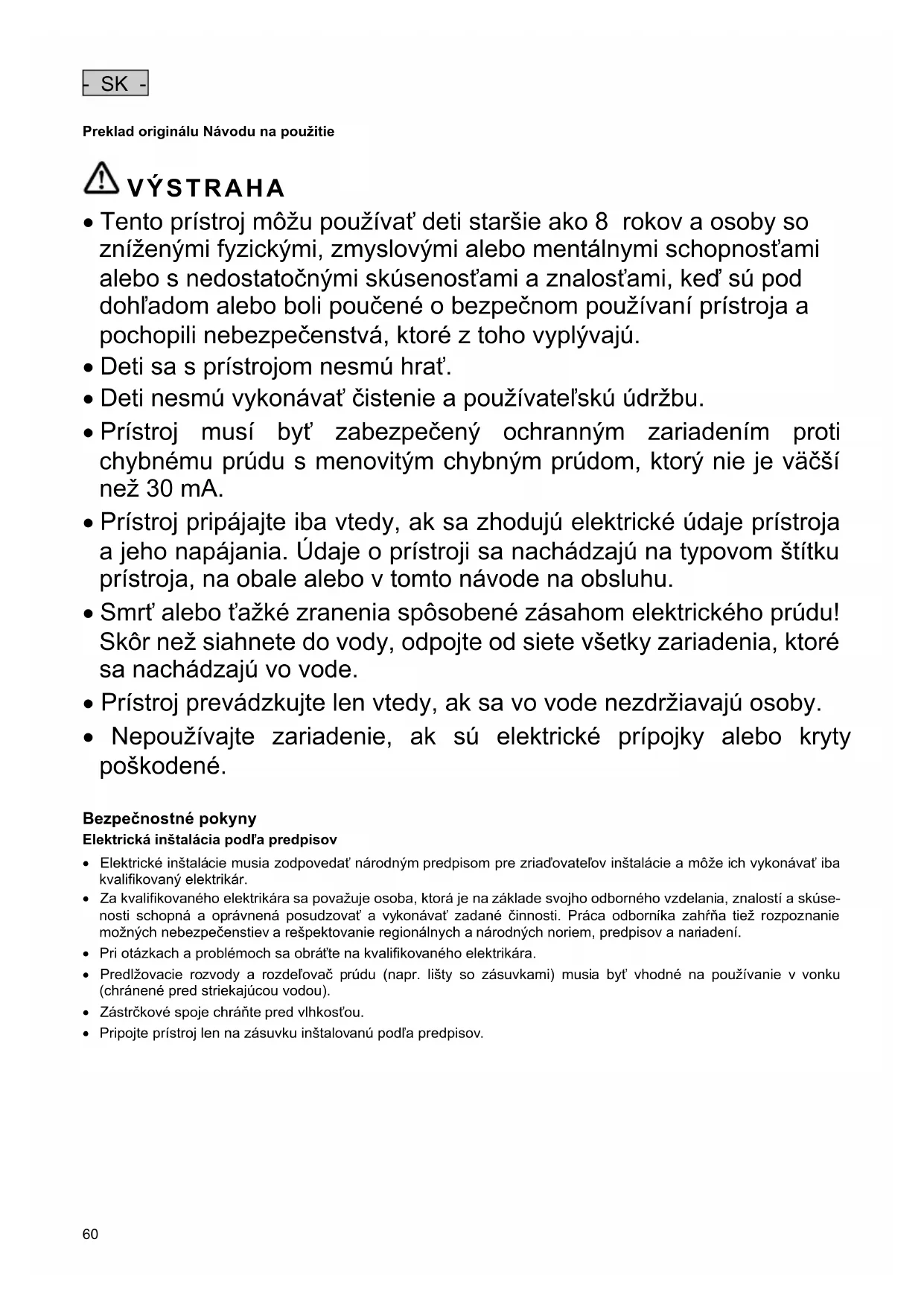 VÝSTRAHA Tento prístroj môžu používať deti staršie ako 8 rokov a osoby so zníženými fyzickými, zmyslovými alebo mentálnymi schopnosťami alebo s nedostatočnými skúsenosťami a znalosťami, keď sú pod dohľadom alebo boli poučené o bezpečnom používaní prístroja a pochopili nebezpečenstvá, ktoré z toho vyplývajú. Deti sa s prístrojom nesmú hrať. Deti nesmú vykonávať čistenie a používateľskú údržbu. Prístroj musí byť zabezpečený ochranným zariadením proti chybnému prúdu s menovitým chybným prúdom, ktorý nie je väčší než 30 mA. Prístroj pripájajte iba vtedy, ak sa zhodujú elektrické údaje prístroja a jeho napájania. Údaje o prístroji sa nachádzajú na typovom štítku prístroja, na obale alebo v tomto návode na obsluhu. Smrť alebo ťažké zranenia spôsobené zásahom elektrického prúdu! Skôr než siahnete do vody, odpojte od siete všetky zariadenia, ktoré sa nachádzajú vo vode. Prístroj prevádzkujte len vtedy, ak sa vo vode nezdržiavajú osoby. Nepoužívajte zariadenie, ak sú elektrické prípojky alebo kryty poškodené.