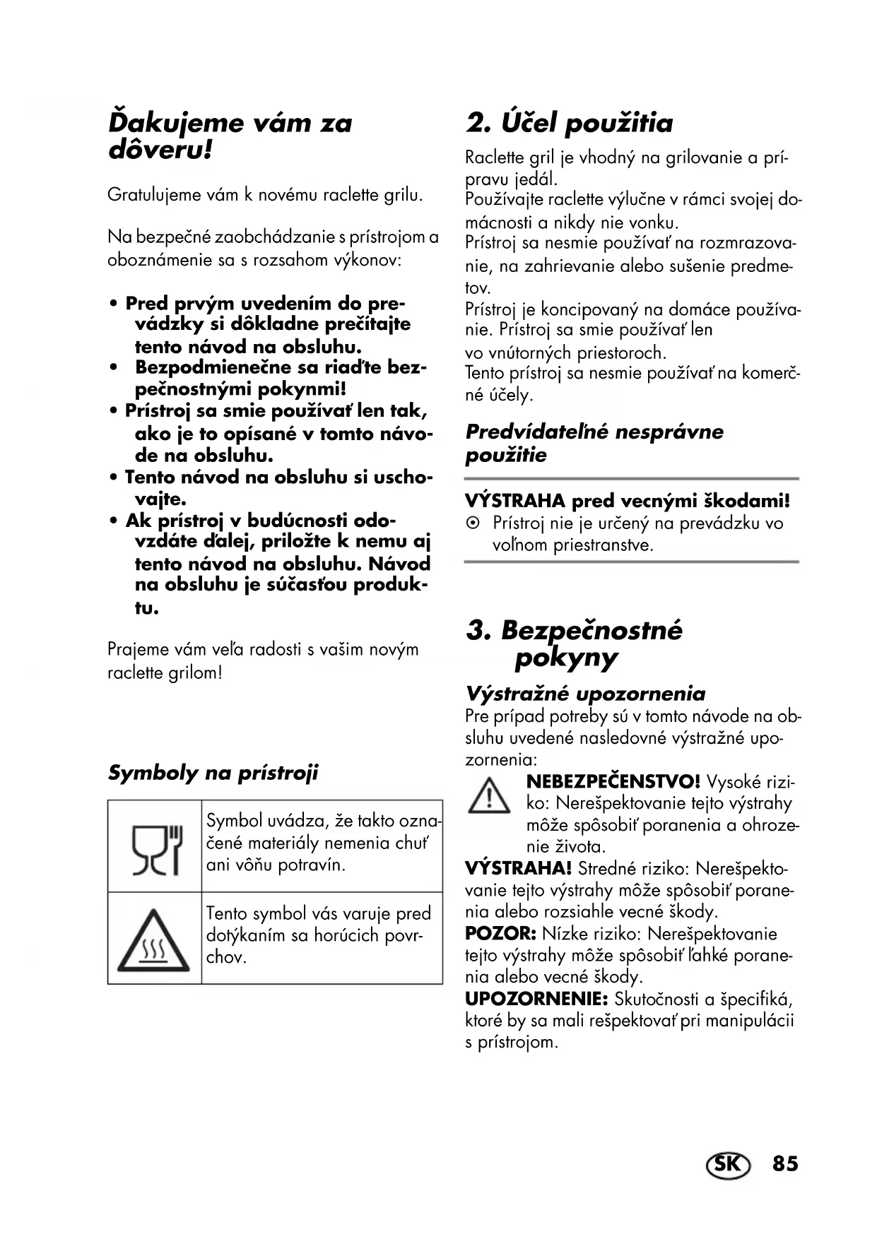 Ďakujeme vám za dôveru! Gratulujeme vám k novému raclette grilu. Na bezpečné zaobchádzanie s prístrojom a oboznámenie sa s rozsahom výkonov: