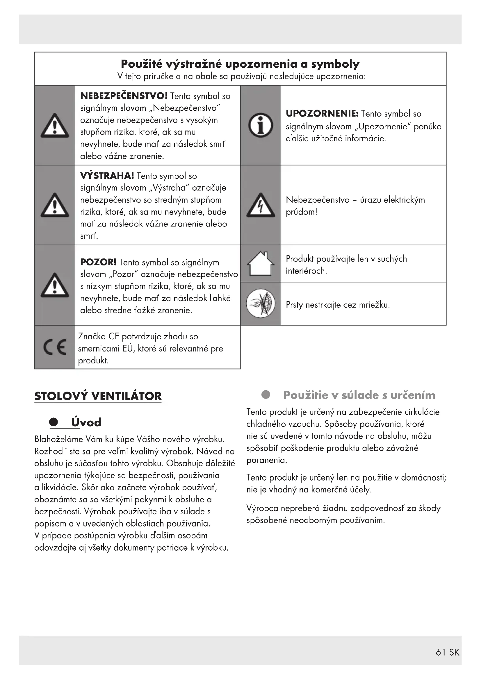 PRODUKTU! V prípade poškodenia z dôvodu nedodržania tohto návodu na obsluhu zaniká nárok na záruku! Za následne vzniknuté škody nepreberáme žiadnu záruku! V prípade majetkových alebo personálnych škôd z dôvodu neodborného používania alebo nedodržania bezpečnostných upozornení nepreberáme žiadnu zodpovednosť! Deti a osoby s postihnutím mNEBEZPEČENSTVO! Nebezpečenstvo udusenia! Deti nenechávajte bez dozoru v blízkosti obalových materiálov. Obalový materiál predstavuje nebezpečenstvo udusenia. Deti často podceňujú nebezpečenstvo spojené s obalovými materiálmi. Nedovoľte, aby sa deti dostali sa do blízkosti obalového materiálu. Tento produkt môžu používať deti od 8 rokov a staršie, ako aj osoby so zníženými fyzickými, zmyslovými alebo duševnými schopnosťami, alebo nedostatkom skúseností a vedomostí, ak sú pod dozorom alebo boli poučené ohľadom bezpečného používania produktu a z toho vyplývajúcich nebezpečenstiev. Čistenie a údržbu nesmú vykonávať deti bez dozoru. Deti sa nesmú s produktom hrať.64 SK Elektrická bezpečnosť mVÝSTRAHA! Nebezpečenstvo poranenia! Produkt vypnite a odpojte ho z elektrickej siete pred vykonaním akýchkoľvek čistiacich prác a tiež vtedy, keď produkt nebudete používať. mVÝSTRAHA! Riziko úrazu elektrickým prúdom! Uistite sa, že menovité napätie na typovom štítku zodpovedá sieťovému napätiu vášho napájacieho zdroja. mVÝSTRAHA! Riziko úrazu elektrickým prúdom! Ak je napájacie vedenie tohto produktu poškodené, musí ho vymeniť výrobca, jeho servisný zástupca, alebo podobne kvalifikovaná osoba, aby sa predišlo nebezpečenstvám. Obsluha Produkt používajte len v suchých interiéroch. Produkt, napájací kábel a sieťovú zástrčku chráňte pred prachom, priamym slnečným žiarením, kvapkajúcou a striekajúcou vodou. mPOZOR! Nebezpečenstvo poranenia! Pred vybratím ochrannej mriežky odpojte produkt od napájania. mPOZOR! Nebezpečenstvo poranenia! Produkt nikdy nepoužívajte bez alebo s poškodenou ochrannou mriežkou. mPOZOR! Nebezpečenstvo poranenia! Počas používania udržiavajte ruky, vlasy, oblečenie a iné predmety mimo bezpečnostnej mriežky, aby ste predišli poraneniam alebo poškodeniam produktu.65 SK Pred použitím Vybalenie Odstráňte obalový materiál. Skontrolujte, či produkt nie je poškodený. Montáž Potrebné príslušenstvo: Krížový skrutkovač Počet potrebných osôb pri montáži: 1dospelá osoba Obr. Krok