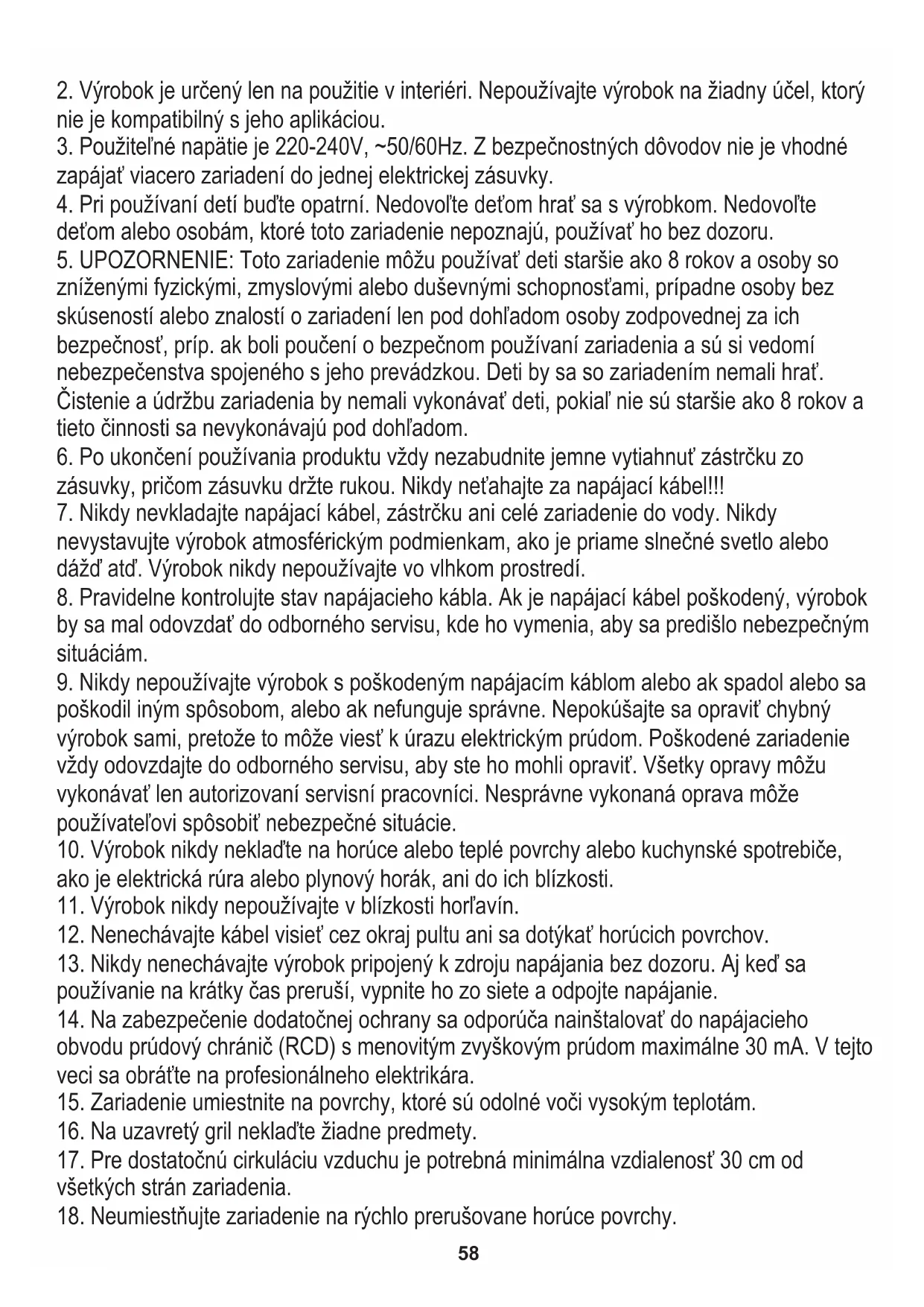 Výrobca nezodpovedá za žiadne škody spôsobené akýmkoľvek nesprávnym použitím. Záručné podmienky sú odlišné, ak sa zariadenie používa na komerčné účely.“ BEZPEČNOSTNÉ PODMIENKY DÔLEŽITÉ POKYNY TÝKAJÚCE SA BEZPEČNOSTI POUŽÍVANIA, ČÍTAJTE POZORNE A UCHOVÁVAJTE PRE BUDÚCE POUŽITIE58
