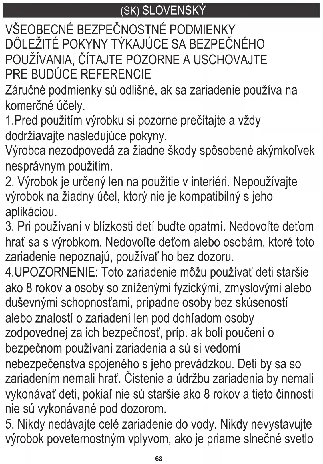 výrobok na žiadny účel, ktorý nie je kompatibilný s jeho aplikáciou. 4.UPOZORNENIE: Toto zariadenie môžu používať deti staršie ako 8 rokov a osoby so zníženými fyzickými, zmyslovými alebo duševnými schopnosťami, prípadne osoby bez skúseností alebo znalostí o zariadení len pod dohľadom osoby zodpovednej za ich bezpečnosť, príp. ak boli poučení o bezpečnom používaní zariadenia a sú si vedomí nebezpečenstva spojeného s jeho prevádzkou. Deti by sa so zariadením nemali hrať. Čistenie a údržbu zariadenia by nemali vykonávať deti, pokiaľ nie sú staršie ako 8 rokov a tieto činnosti nie sú vykonávané pod dozorom.