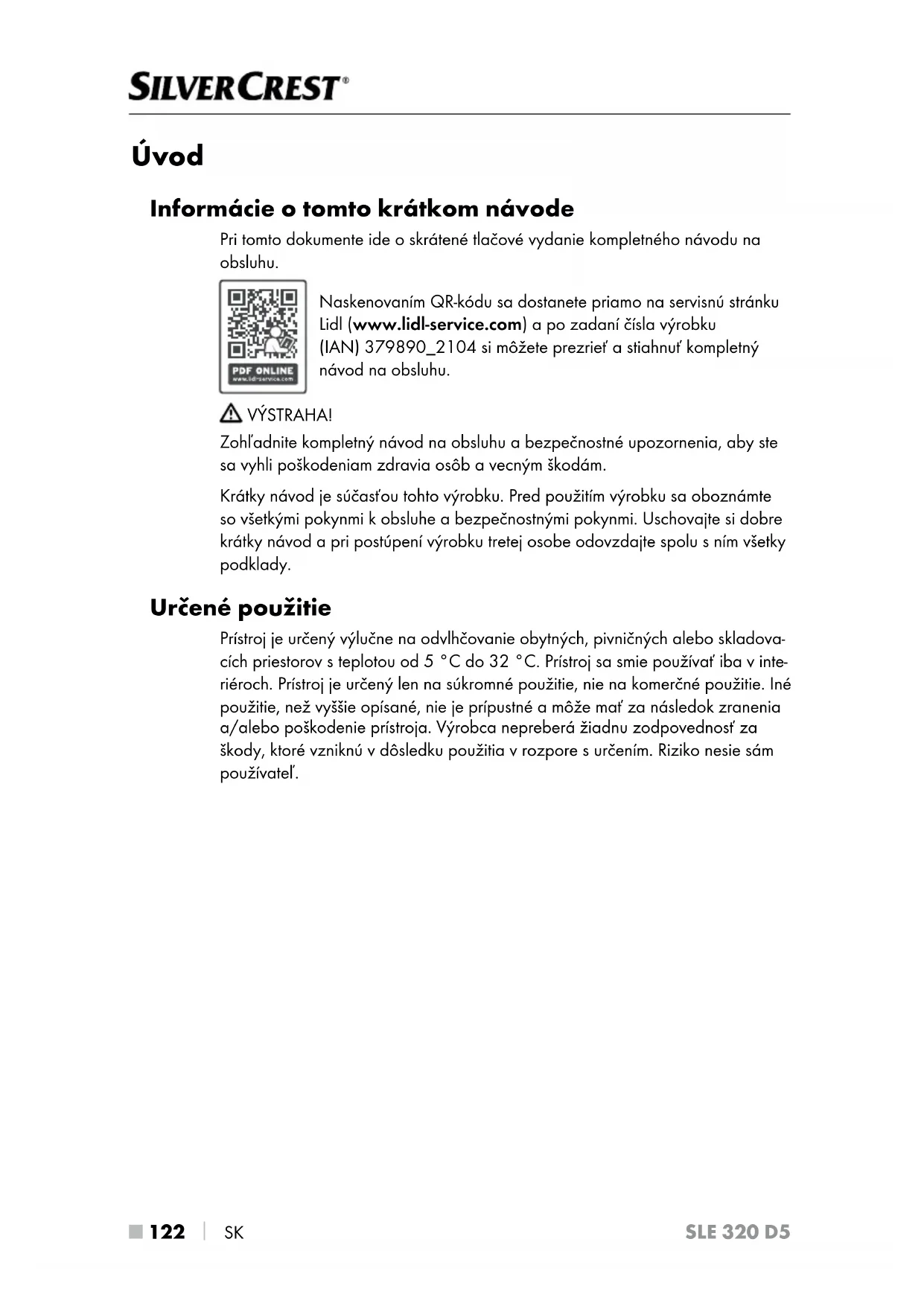 SK SLE 320 D5 Úvod Informácie o tomto krátkom návode Pri tomto dokumente ide o skrátené tlačové vydanie kompletného návodu na obsluhu. Naskenovaním QR-kódu sa dostanete priamo na servisnú stránku Lidl (www.lidl-service.com) a po zadaní čísla výrobku (IAN) 379890_2104 si môžete prezrieť a stiahnuť kompletný návod na obsluhu. VÝSTRAHA! Zohľadnite kompletný návod na obsluhu a bezpečnostné upozornenia, aby ste sa vyhli poškodeniam zdravia osôb a vecným škodám. Krátky návod je súčasťou tohto výrobku. Pred použitím výrobku sa oboznámte sovšetkými pokynmi k obsluhe a bezpečnostnými pokynmi. Uschovajte si dobre krátky návod a pri postúpení výrobku tretej osobe odovzdajte spolu sním všetky podklady. Určené použitie Prístroj je určený výlučne naodvlhčovanie obytných, pivničných alebo skladova- cích priestorov steplotou od 5°C do 32°C. Prístroj sa smie používať iba vinte- riéroch. Prístroj je určený len na súkromné použitie, nie na komerčné použitie. Iné použitie, než vyššie opísané, nie je prípustné a môže mať za následok zranenia a/alebo poškodenie prístroja. Výrobca nepreberá žiadnu zodpovednosť za škody, ktoré vzniknú vdôsledku použitia vrozpore surčením. Riziko nesie sám používateľ.SK
