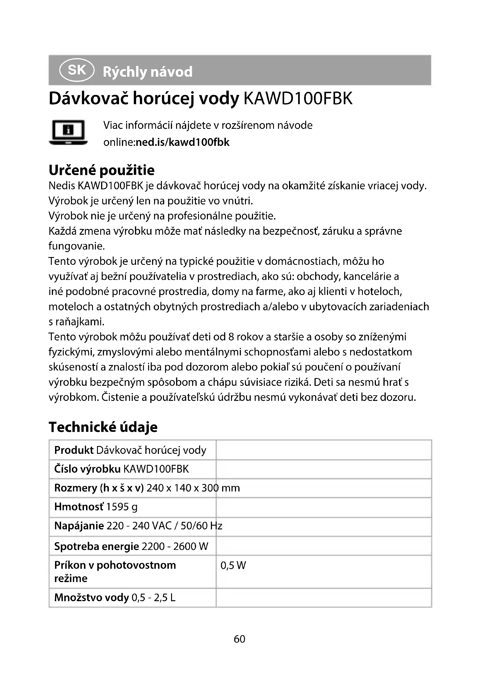 Rýchly návod Dávkovač horúcej vody KAWD100FBK Viac informácií nájdete v rozšírenom návode online:ned.is/kawd100fbk Určené použitie Nedis KAWD100FBK je dávkovač horúcej vody na okamžité získanie vriacej vody. Výrobok je určený len na použitie vo vnútri. Výrobok nie je určený na profesionálne použitie. Každá zmena výrobku môže mať následky na bezpečnosť, záruku a správne fungovanie. Tento výrobok je určený na typické použitie v domácnostiach, môžu ho využívať aj bežní používatelia v prostrediach, ako sú: obchody, kancelárie a iné podobné pracovné prostredia, domy na farme, ako aj klienti v hoteloch, moteloch aostatných obytných prostrediach a/alebo v ubytovacích zariadeniach s raňajkami. Tento výrobok môžu používať deti od 8 rokov a staršie a osoby so zníženými fyzickými, zmyslovými alebo mentálnymi schopnosťami alebo s nedostatkom skúseností a znalostí iba pod dozorom alebo pokiaľ sú poučení o používaní výrobku bezpečným spôsobom a chápu súvisiace riziká. Deti sa nesmú hrať s výrobkom. Čistenie a používateľskú údržbu nesmú vykonávať deti bez dozoru. Technické údaje Produkt Dávkovač horúcej vody Číslo výrobku KAWD100FBK Rozmery (h x š x v) 240 x 140 x 300 mm Hmotnosť 1595 g Napájanie 220 - 240 VAC / 50/60 Hz Spotreba energie 2200 - 2600 W Príkon v pohotovostnom režime 0,5 W Množstvo vody 0,5 - 2,5 L KAWD100FBK_MAN_COMP_0520_print_(20161 1422)_v00.01.indd 60KAWD100FBK_MAN_COMP_0520_print_(20161 1422)_v00.01.indd 60 18-05-2020 09:0818-05-2020 09:0861 Hlavné časti (obrázok A)