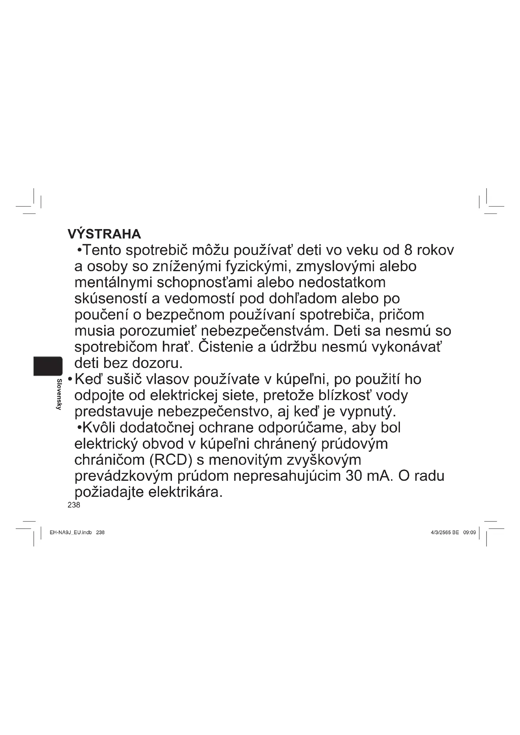 - Kvôli dodatočnej ochrane odporúčame, aby bol elektrický obvod v kúpeľni chránený prúdovým chráničom (RCD) s menovitým zvyškovým prevádzkovým prúdom nepresahujúcim 30 mA. O radu požiadajte elektrikára. EH-NA9J_EU.indb 238EH-NA9J_EU.indb 238 4/3/2565 BE 09:094/3/2565 BE 09:09239 Slovensky