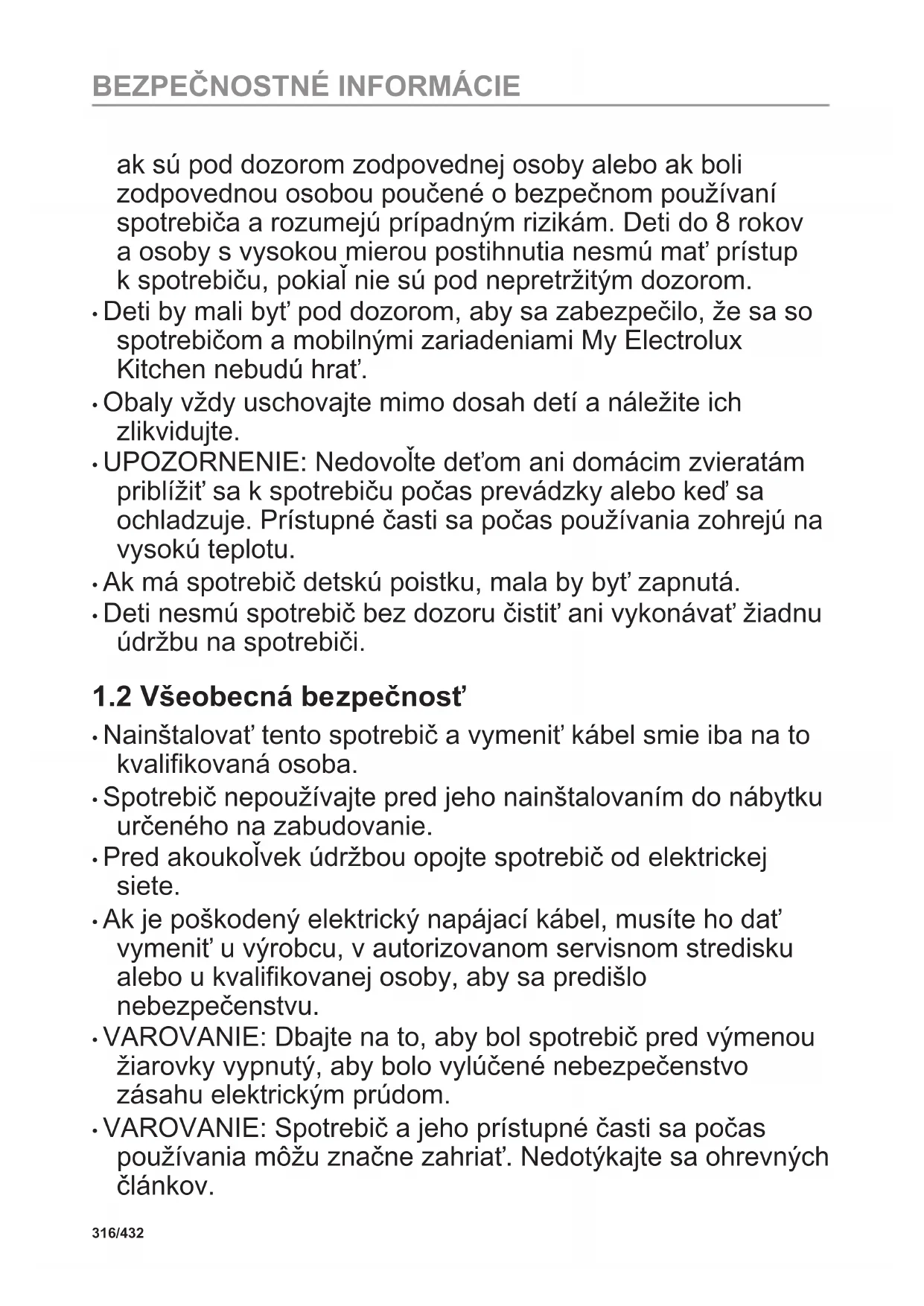 - Tento spotrebič smú používať deti staršie ako 8 rokov a osoby so zníženou fyzickou, zmyslovou alebo psychickou spôsobilosťou alebo nedostatkom skúseností a znalostí, iba 315/432 BEZPEČNOSTNÉ INFORMÁCIEak sú pod dozorom zodpovednej osoby alebo ak boli zodpovednou osobou poučené o bezpečnom používaní spotrebiča a rozumejú prípadným rizikám. Deti do 8 rokov a osoby s vysokou mierou postihnutia nesmú mať prístup k spotrebiču, pokiaľ nie sú pod nepretržitým dozorom.