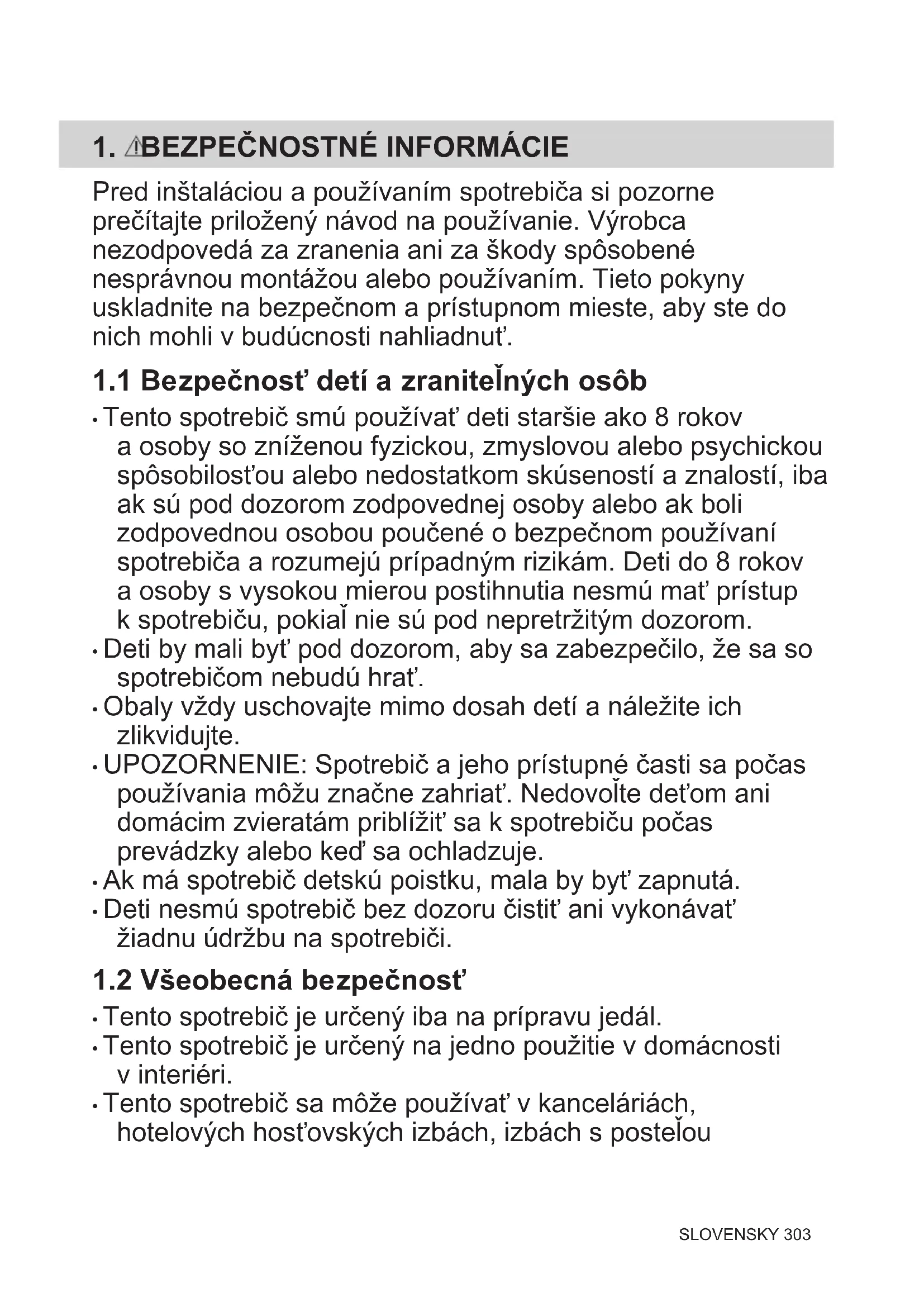 - Tento spotrebič smú používať deti staršie ako 8 rokov a osoby so zníženou fyzickou, zmyslovou alebo psychickou spôsobilosťou alebo nedostatkom skúseností a znalostí, iba ak sú pod dozorom zodpovednej osoby alebo ak boli zodpovednou osobou poučené o bezpečnom používaní spotrebiča a rozumejú prípadným rizikám. Deti do 8 rokov a osoby s vysokou mierou postihnutia nesmú mať prístup k spotrebiču, pokiaľ nie sú pod nepretržitým dozorom.