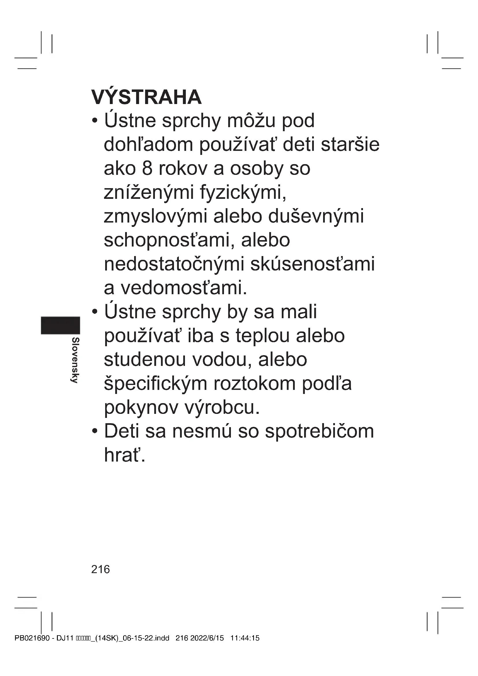 - Osoby so slabým citom v ústach nesmú spotrebič používať. - V opačnom prípade môže dôjsť k poraneniu alebo poškodeniu zubov a ďasien. Nikdy nepoužívajte na žiadny iný účel, len na čistenie ústnej dutiny. - Keď prúd vody smeruje do očí, nosa, uší, jazyka alebo hrdla, môže to spôsobiť nehodu alebo poranenie. PB021690 - DJ11 _(14SK)_06-15-22.indd 218 2022/6/15 11:44:15219 Slovensky UPOZORNENIE Nádržku nenapĺňajte vodou, ktorá má teplotu vyššiu ako 40 °C. - V opačnom prípade môže dôjsť k popáleninám. Trysku nepoužívajte spoločne s ostatnými členmi rodiny ani spoločne s inými osobami. - V opačnom prípade môže dôjsť k infekcii alebo zápalu. Zabráňte pádu alebo nárazu. - V opačnom prípade môže dôjsť k poraneniu. Prívodné koncovky batérie sa nesmú skratovať. - V opačnom prípade by mohlo dôjsť k popáleninám alebo poraneniu. Osoby, ktoré trpia periodontálnym ochorením, mali ošetrené zuby alebo majú obavy zo symptómov vo svojej ústnej dutine, sa musia pred použitím poradiť so zubným lekárom. - Ignorovanie upozornenia môže mať za následok poranenie alebo poškodenie zubov a ďasien. Po použití vyčistite hlavnú časť, nádržku a trysku a vysušte ich. - V opačnom prípade môže dôjsť k poškodeniu zdravia v dôsledku šírenia plesní a baktérií. PB021690 - DJ11 _(14SK)_06-15-22.indd 219 2022/6/15 11:44:15220 Slovensky UPOZORNENIE