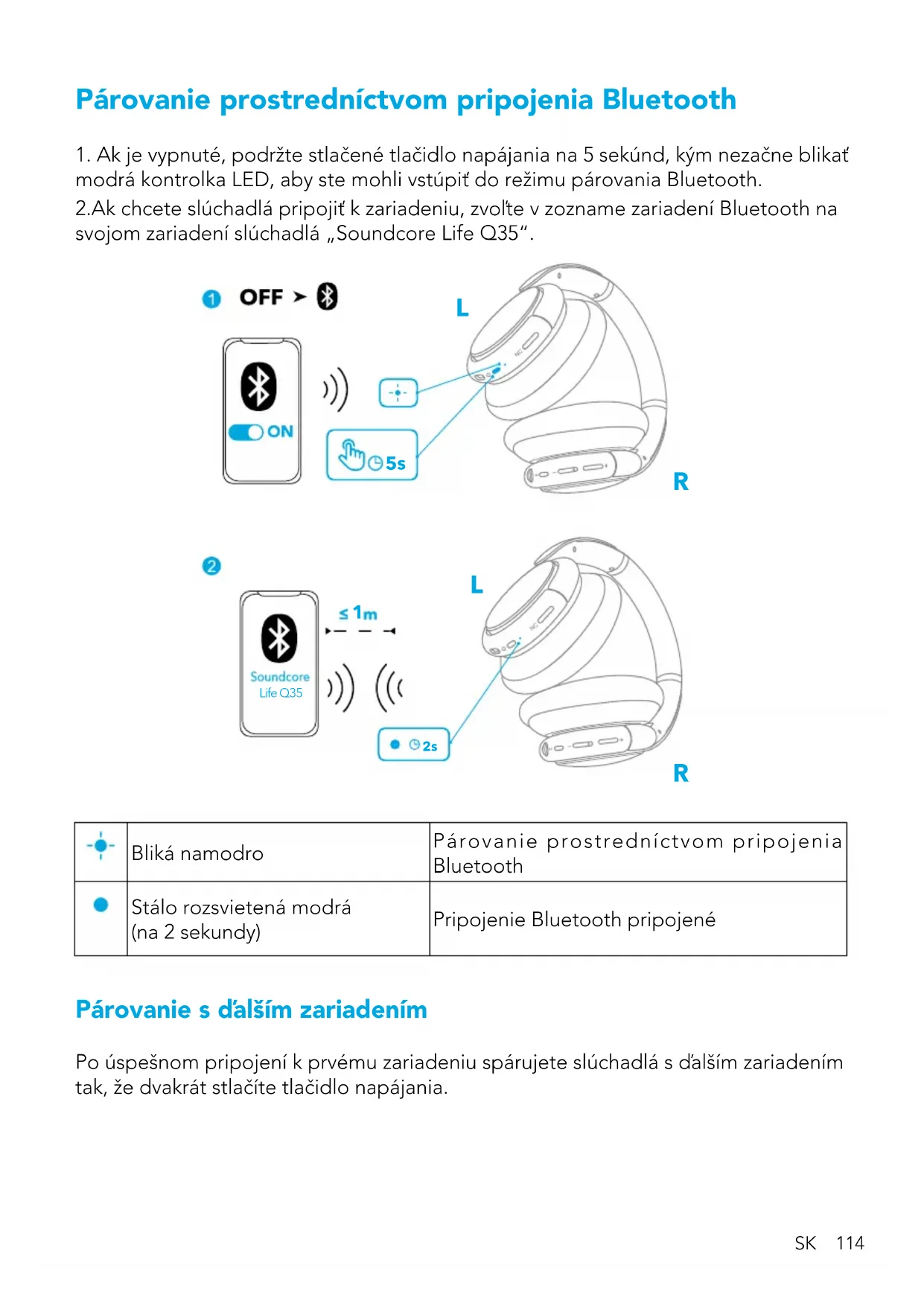 modrá kontrolka LED, aby ste mohli vstúpiť do režimu párovania Bluetooth. 2.Ak chcete slúchadlá pripojiť k zariadeniu, zvoľte v zozname zariadení Bluetooth na svojom zariadení slúchadlá „Soundcore Life Q35“.