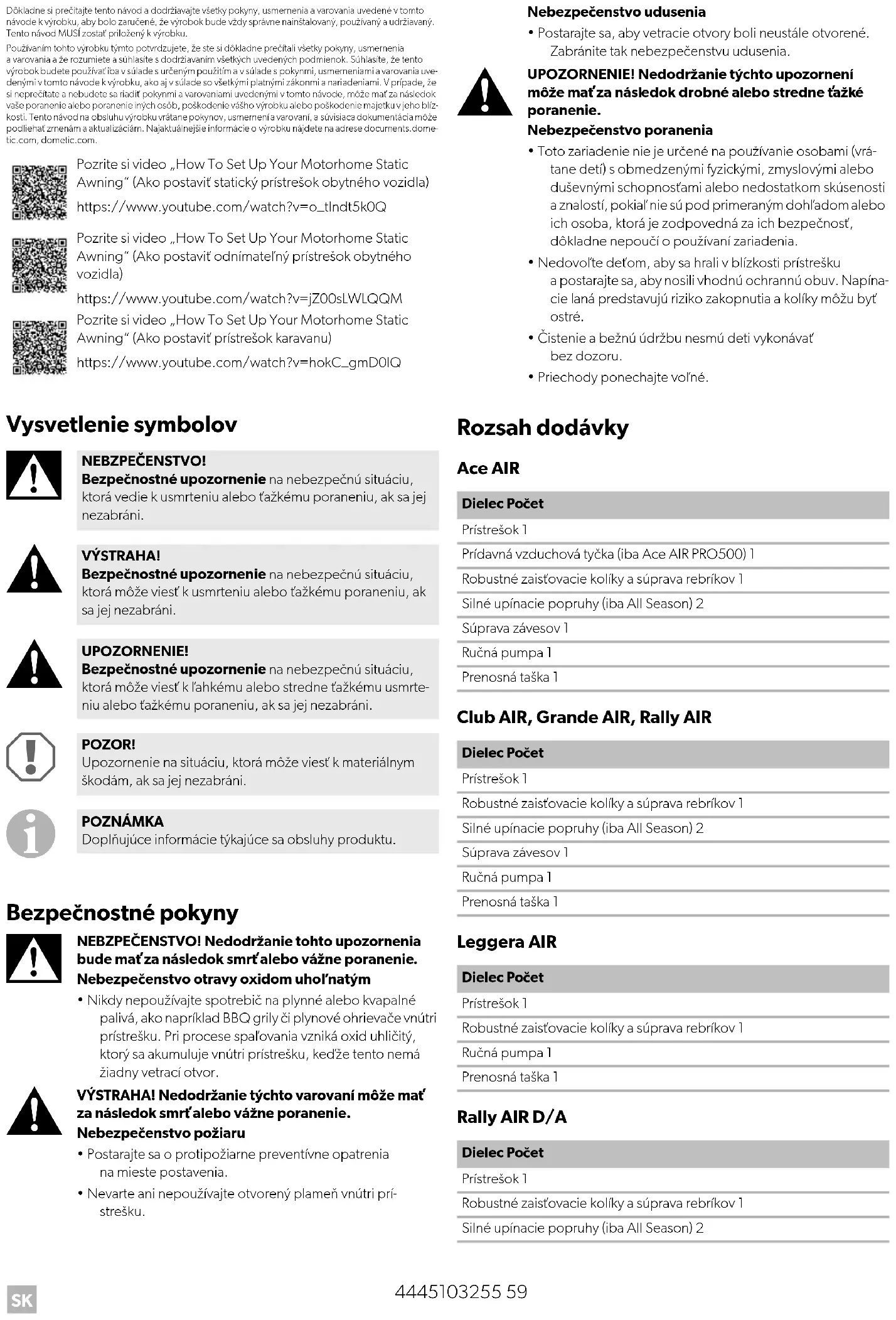 - Priechody ponechajte voľné. Rozsah dodávky Ace AIR Club AIR, Grande AIR, Rally AIR Leggera AIR Rally AIR D/A Pozrite si video „How To Set Up Your Motorhome Static Awning“ (Ako postaviť statický prístrešok obytného vozidla) https://www.youtube.com/watch?v=o_tIndt5k0Q Pozrite si video „How To Set Up Your Motorhome Static Awning“ (Ako postaviť odnímateľný prístrešok obytného vozidla) https://www.youtube.com/watch?v=jZ00sLWLQQM Pozrite si video „How To Set Up Your Motorhome Static Awning“ (Ako postaviť prístrešok karavanu) https://www.youtube.com/watch?v=hokC_gmD0lQ NEBZPEČENSTVO! Bezpečnostné upozornenie na nebezpečnú situáciu, ktorá vedie k usmrteniu alebo ťažkému poraneniu, ak sa jej nezabráni. VÝSTRAHA! Bezpečnostné upozornenie na nebezpečnú situáciu, ktorá môže viesť k usmrteniu alebo ťažkému poraneniu, ak sa jej nezabráni. UPOZORNENIE! Bezpečnostné upozornenie na nebezpečnú situáciu, ktorá môže viesť k ľahkému alebo stredne ťažkému usmrte- niu alebo ťažkému poraneniu, ak sa jej nezabráni. POZOR! Upozornenie na situáciu, ktorá môže viesť k materiálnym škodám, ak sa jej nezabráni. POZNÁMKA Doplňujúce informácie týkajúce sa obsluhy produktu. Dielec Počet Prístrešok 1 Prídavná vzduchová tyčka (iba Ace AIR PRO500) 1 Robustné zaisťovacie kolíky a súprava rebríkov 1 Silné upínacie popruhy (iba All Season) 2 Súprava závesov 1 Ručná pumpa 1 Prenosná taška 1 Dielec Počet Prístrešok 1 Robustné zaisťovacie kolíky a súprava rebríkov 1 Silné upínacie popruhy (iba All Season) 2 Súprava závesov 1 Ručná pumpa 1 Prenosná taška 1 Dielec Počet Prístrešok 1 Robustné zaisťovacie kolíky a súprava rebríkov 1 Ručná pumpa 1 Prenosná taška 1 Dielec Počet Prístrešok 1 Robustné zaisťovacie kolíky a súprava rebríkov 1 Silné upínacie popruhy (iba All Season) 2SK