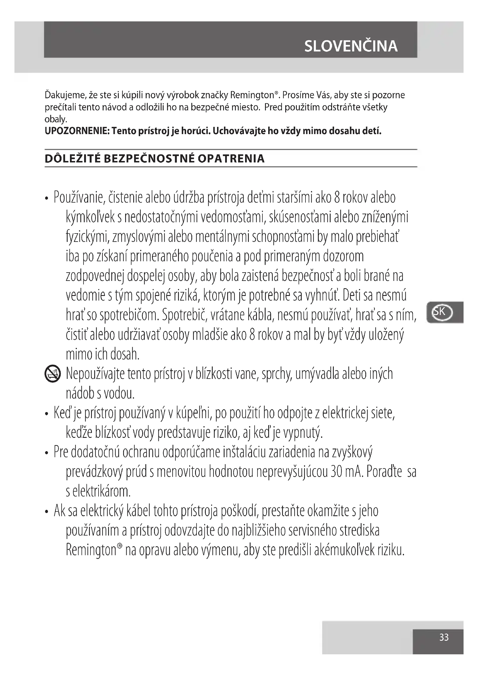 - Ak sa elektricky kabel tohto pristroja poškodi, prestaţe okamžite s jeho použivanim a pristroj odovzdajte do njblžsieho servisného strediska Remington® na opravu alebo výmenu, aby ste predišli akémukol'vek riziku.