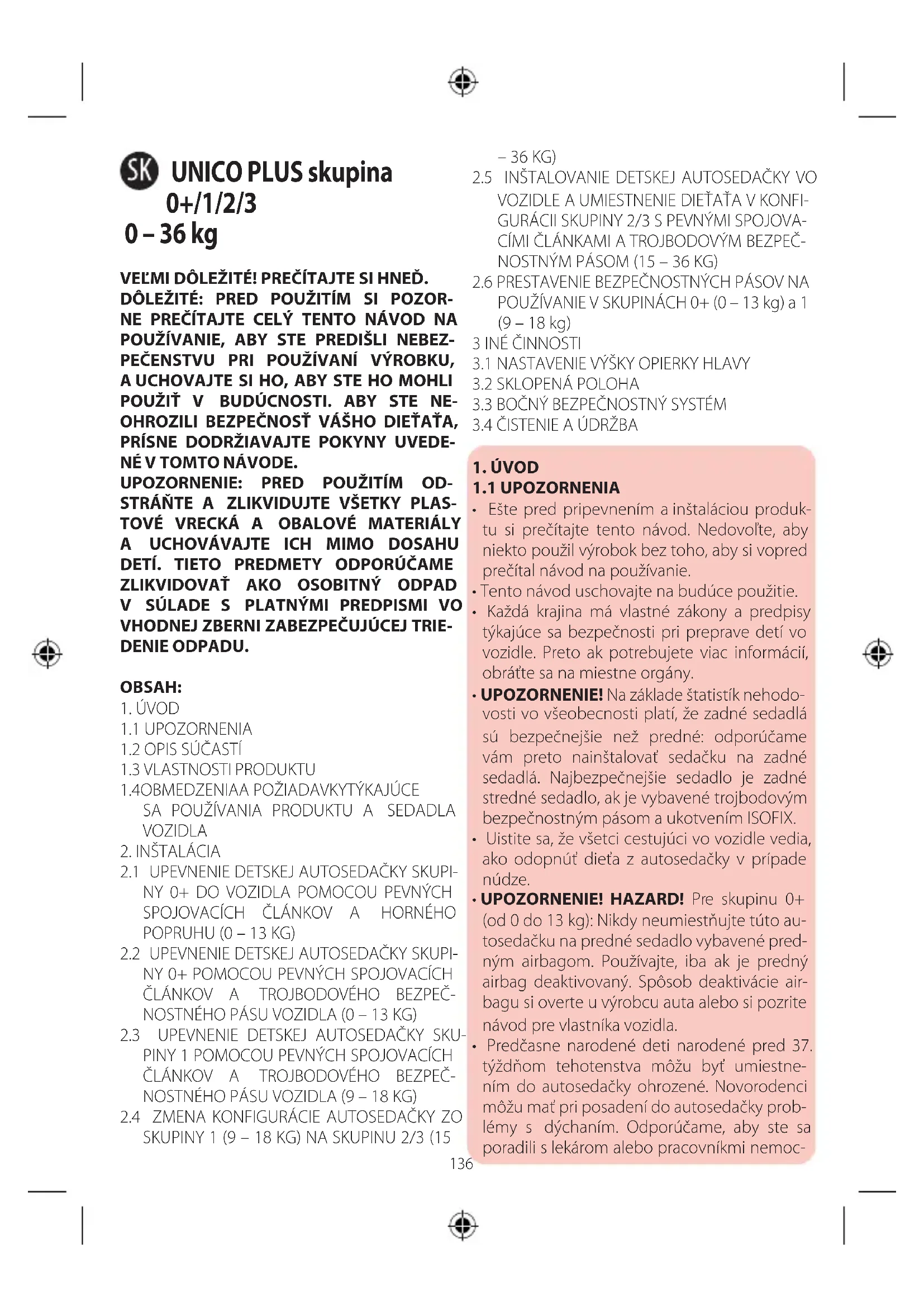 - UPOZORNENIE! HAZARD! Pre skupinu 0+ (od 0 do 13 kg): Nikdy neumiestňujte túto au- tosedačku na predné sedadlo vybavené pred- ným airbagom. Používajte, iba ak je predný airbag deaktivovaný. Spôsob deaktivácie air- bagu si overte uvýrobcu auta alebo si pozrite návod pre vlastníka vozidla.