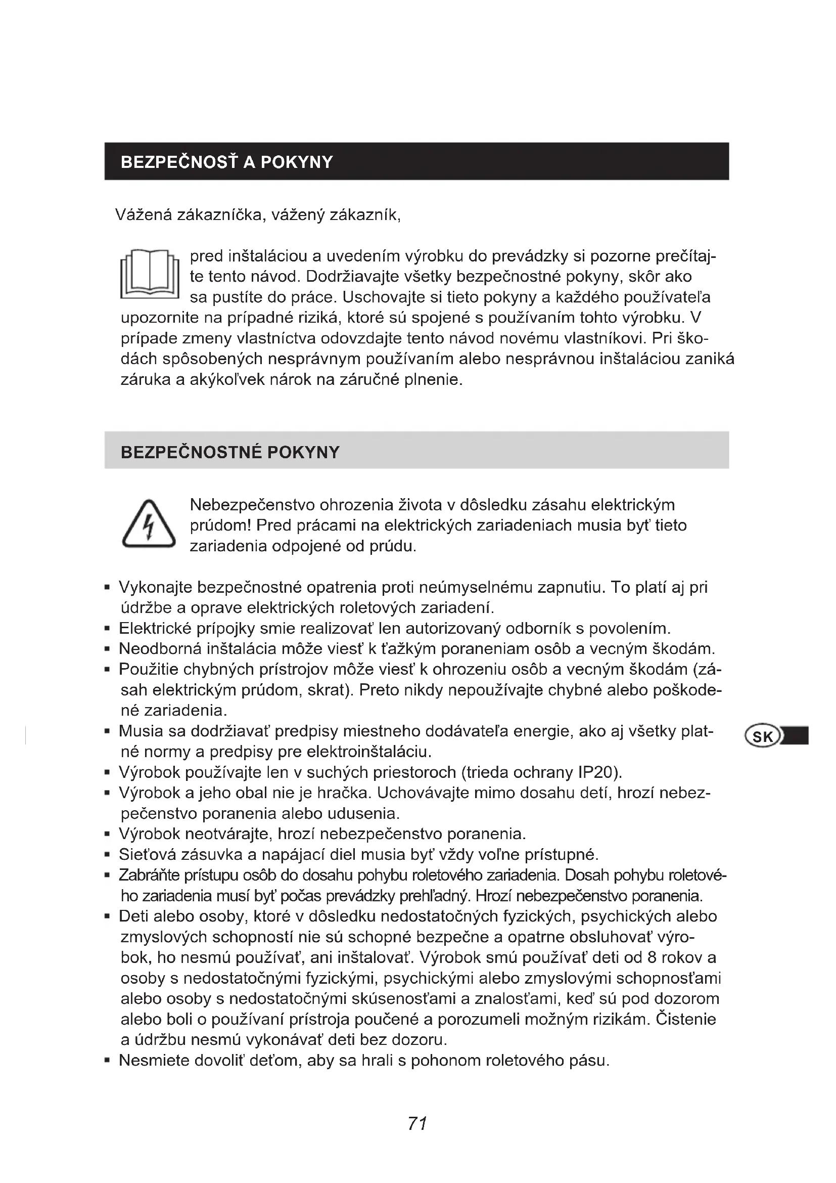 Nebezpečenstvo ohrozenia života v dôsledku zásahu elektrickým prúdom! Pred prácami na elektrických zariadeniach musia byť tieto zariadenia odpojené od prúdu. Vykonajte bezpečnostné opatrenia proti neúmyselnému zapnutiu. To platí aj pri údržbe a oprave elektrických roletových zariadení. Elektrické prípojky smie realizovať len autorizovaný odborník s povolením. Neodborná inštalácia môže viesť k ťažkým poraneniam osôb a vecným škodám. Použitie chybných prístrojov môže viesť k ohrozeniu osôb a vecným škodám (zá- sah elektrickým prúdom, skrat). Preto nikdy nepoužívajte chybné alebo poškode- né zariadenia Musia sa dodržiavať predpisy miestneho dodávateľa energie, ako aj všetky plat- né normy a predpisy pre elektroinštaláciu. Výrobok používajte len v suchých priestoroch (trieda ochrany IP20). Výrobok a jeho obal nie je hračka. Uchovávajte mimo dosahu detí, hrozí nebez- pečenstvo poranenia alebo udusenia. Výrobok neotvárajte, hrozí nebezpečenstvo poranenia. Sieťová zásuvka a napájací diel musia byť vždy voľne prístupné. Zabráňte prístupu osôb do dosahu pohybu roletového zariadenia. Dosah pohybu roletové- ho zariadenia musí byť počas prevádzky prehľadný. Hrozí nebezpečenstvo poranenia. Deti alebo osoby, ktoré v dôsledku nedostatočných fyzických, psychických alebo zmyslových schopností nie sú schopné bezpečne a opatrne obsluhovať výro- bok, ho nesmú používať, ani inštalovať. Výrobok smú používať deti od 8 rokov a osoby s nedostatočnými fyzickými, psychickými alebo zmyslovými schopnosťami alebo osoby s nedostatočnými skúsenosťami a znalosťami, keď sú pod dozorom alebo boli o používaní prístroja poučené a porozumeli možným rizikám. Čistenie a údržbu nesmú vykonávať deti bez dozoru. Nesmiete dovoliť deťom, aby sa hrali s pohonom roletového pásu.72