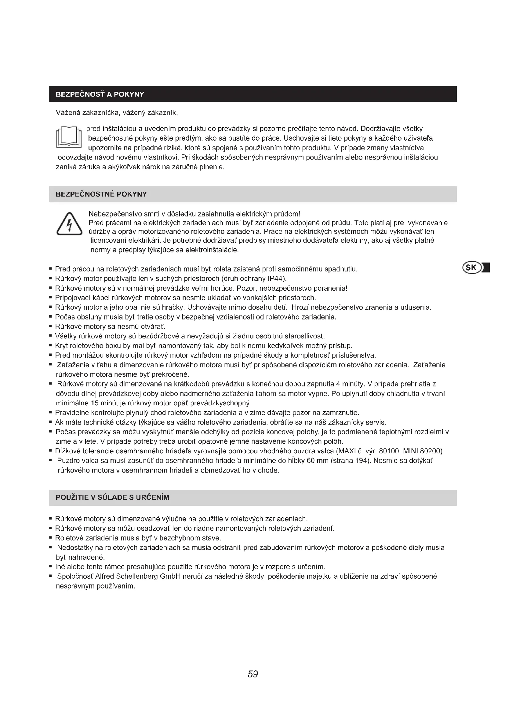 BEzpEčnoSť A poKyny Vážená zákazníčka, vážený zákazník, pred inštaláciou a uvedením produktu do prevádzky si pozorne prečítajte tento návod. Dodržiavajte všetky bezpečnostné pokyny ešte predtým, ako sa pustíte do práce. Uschovajte si tieto pokyny a každého užívateľa upozornite na prípadné riziká, ktoré sú spojené s používaním tohto produktu. V prípade zmeny vlastníctva odovzdajte návod novému vlastníkovi. Pri škodách spôsobených nesprávnym používaním alebo nesprávnou inštaláciou zaniká záruka a akýkoľvek nárok na záručné plnenie. BEzpEčnoStné poKyny Nebezpečenstvo smrti v dôsledku zasiahnutia elektrickým prúdom! Pred prácami na elektrických zariadeniach musí byť zariadenie odpojené od prúdu. Toto platí aj pre vykonávanie údržby a opráv motorizovaného roletového zariadenia. Práce na elektrických systémoch môžu vykonávať len licencovaní elektrikári. Je potrebné dodržiavať predpisy miestneho dodávateľa elektriny, ako aj všetky platné normy a predpisy týkajúce sa elektroinštalácie. Pred prácou na roletových zariadeniach musí byť roleta zaistená proti samočinnému spadnutiu. Rúrkový motor používajte len v suchých priestoroch (druh ochrany IP44). Rúrkové motory sú v normálnej prevádzke veľmi horúce. Pozor, nebezpečenstvo poranenia! Pripojovací kábel rúrkových motorov sa nesmie ukladať vo vonkajších priestoroch. Rúrkový motor a jeho obal nie sú hračky. Uchovávajte mimo dosahu detí. Hrozí nebezpečenstvo zranenia a udusenia. Počas obsluhy musia byť tretie osoby v bezpečnej vzdialenosti od roletového zariadenia. Rúrkové motory sa nesmú otvárať. Všetky rúrkové motory sú bezúdržbové a nevyžadujú si žiadnu osobitnú starostlivosť. Kryt roletového boxu by mal byť namontovaný tak, aby bol k nemu kedykoľvek možný prístup. Pred montážou skontrolujte rúrkový motor vzhľadom na prípadné škody a kompletnosť príslušenstva. Zaťaženie v ťahu a dimenzovanie rúrkového motora musí byť prispôsobené dispozíciám roletového zariadenia. Zaťaženie rúrkového motora nesmie byť prekročené. Rúrkové motory sú dimenzované na krátkodobú prevádzku s konečnou dobou zapnutia 4 minúty. V prípade prehriatia z dôvodu dlhej prevádzkovej doby alebo nadmerného zaťaženia ťahom sa motor vypne. Po uplynutí doby chladnutia v trvaní minimálne 15 minút je rúrkový motor opäť prevádzkyschopný. Pravidelne kontrolujte plynulý chod roletového zariadenia a v zime dávajte pozor na zamrznutie. Ak máte technické otázky týkajúce sa vášho roletového zariadenia, obráťte sa na náš zákaznícky servis. Počas prevádzky sa môžu vyskytnúť menšie odchýlky od pozície koncovej polohy, je to podmienené teplotnými rozdielmi v zime a v lete. V prípade potreby treba urobiť opätovné jemné nastavenie koncových polôh. Dĺžkové tolerancie osemhranného hriadeľa vyrovnajte pomocou vhodného puzdra valca (MAXI č. výr. 80100, MINI 80200). Puzdro valca sa musí zasunúť do osemhranného hriadeľa minimálne do hĺbky 60 mm (strana 194). Nesmie sa dotýkať rúrkového motora v osemhrannom hriadeli a obmedzovať ho v chode. poUžitiE v SúLADE S UrčEním Rúrkové motory sú dimenzované výlučne na použitie v roletových zariadeniach. Rúrkové motory sa môžu osadzovať len do riadne namontovaných roletových zariadení. Roletové zariadenia musia byť v bezchybnom stave. Nedostatky na roletových zariadeniach sa musia odstrániť pred zabudovaním rúrkových motorov a poškodené diely musia byť nahradené. Iné alebo tento rámec presahujúce použitie rúrkového motora je v rozpore s určením. Spoločnosť Alfred Schellenberg GmbH neručí za následné škody, poškodenie majetku a ublíženie na zdraví spôsobené nesprávnym používaním.60