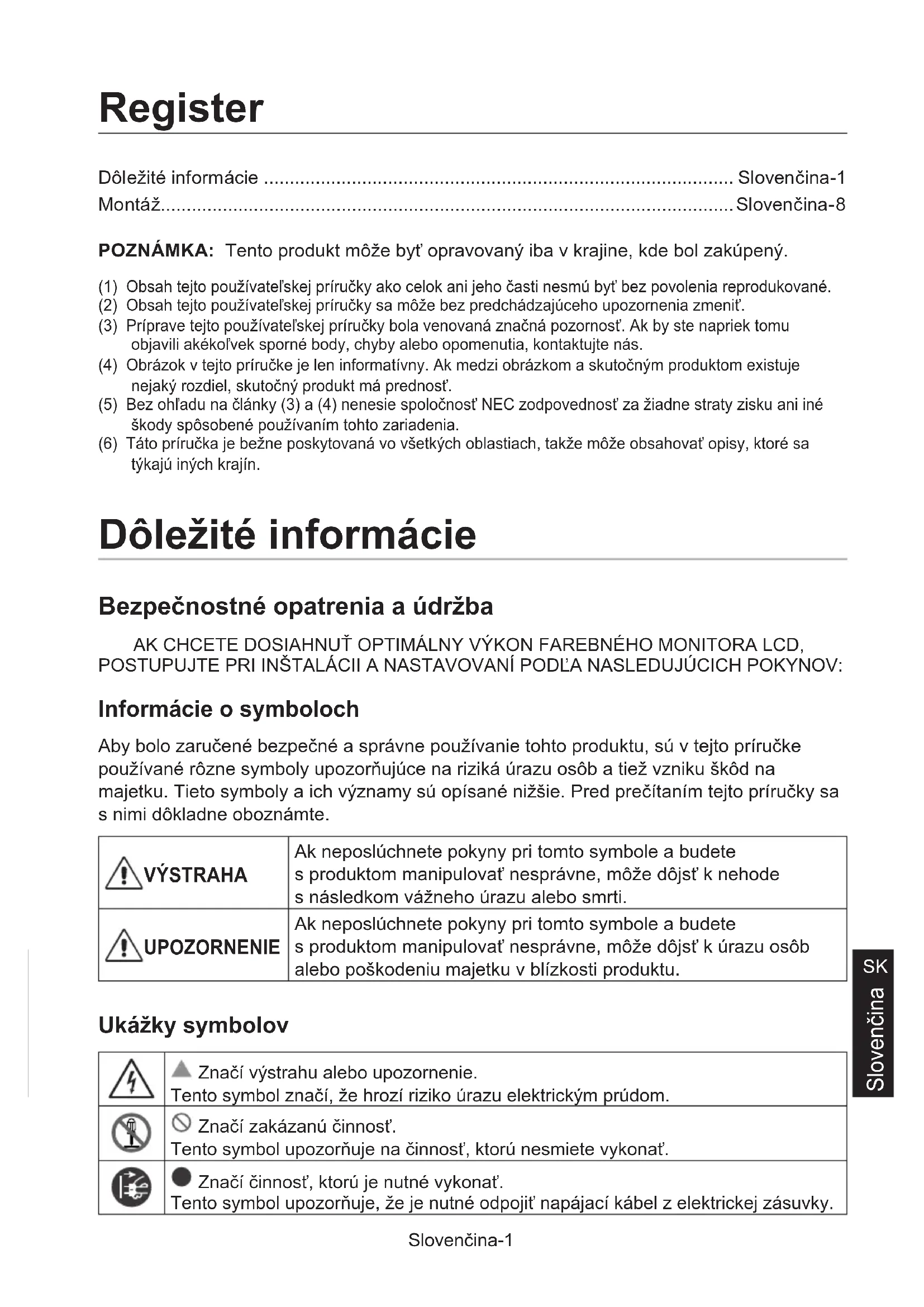 Slovenčina Dôležité informácie ........................................................................................... Slovenčina-1 Montáž...............................................................................................................Slovenčina-8 Register POZNÁMKA: Tento produkt môže byť opravovaný iba v krajine, kde bol zakúpený. (1) Obsah tejto používateľskej príručky ako celok ani jeho časti nesmú byť bez povolenia reprodukované.(2) Obsah tejto používateľskej príručky sa môže bez predchádzajúceho upozornenia zmeniť.(3) Príprave tejto používateľskej príručky bola venovaná značná pozornosť. Ak by ste napriek tomu objavili akékoľvek sporné body, chyby alebo opomenutia, kontaktujte nás.(4) Obrázok v tejto príručke je len informatívny. Ak medzi obrázkom a skutočným produktom existuje nejaký rozdiel, skutočný produkt má prednosť.(5) Bez ohľadu na články (3) a (4) nenesie spoločnosť NEC zodpovednosť za žiadne straty zisku ani iné škody spôsobené používaním tohto zariadenia.(6) Táto príručka je bežne poskytovaná vo všetkých oblastiach, takže môže obsahovať opisy, ktoré sa týkajú iných krajín. Dôležité informácie Bezpečnostné opatrenia a údržba AK CHCETE DOSIAHNUŤ OPTIMÁLNY VÝKON FAREBNÉHO MONITORA LCD, POSTUPUJTE PRI INŠTALÁCII A NASTAVOVANÍ PODĽA NASLEDUJÚCICH POKYNOV: Informácie o symboloch Aby bolo zaručené bezpečné a správne používanie tohto produktu, sú v tejto príručke používané rôzne symboly upozorňujúce na riziká úrazu osôb a tiež vzniku škôd na majetku. Tieto symboly a ich významy sú opísané nižšie. Pred prečítaním tejto príručky sa s nimi dôkladne oboznámte. VÝSTRAHA Ak neposlúchnete pokyny pri tomto symbole a budete s produktom manipulovať nesprávne, môže dôjsť k nehode s následkom vážneho úrazu alebo smrti. UPOZORNENIE Ak neposlúchnete pokyny pri tomto symbole a budete s produktom manipulovať nesprávne, môže dôjsť k úrazu osôb alebo poškodeniu majetku v blízkosti produktu. Ukážky symbolov Značí výstrahu alebo upozornenie. Tento symbol značí, že hrozí riziko úrazu elektrickým prúdom. Značí zakázanú činnosť. Tento symbol upozorňuje na činnosť, ktorú nesmiete vykonať. Značí činnosť, ktorú je nutné vykonať. Tento symbol upozorňuje, že je nutné odpojiť napájací kábel z elektrickej zásuvky.Slovenčina-2 VÝSTRAHA