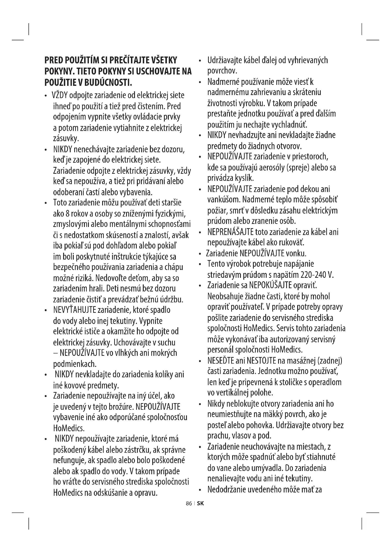 - NIKDY nepoužívajte zariadenie, ktoré má poškodený kábel alebo zástrčku, ak správne nefunguje, ak spadlo alebo bolo poškodené alebo ak spadlo do vody. V takom prípade ho vráťte do servisného strediska spoločnosti HoMedics na odskúšanie a opravu.