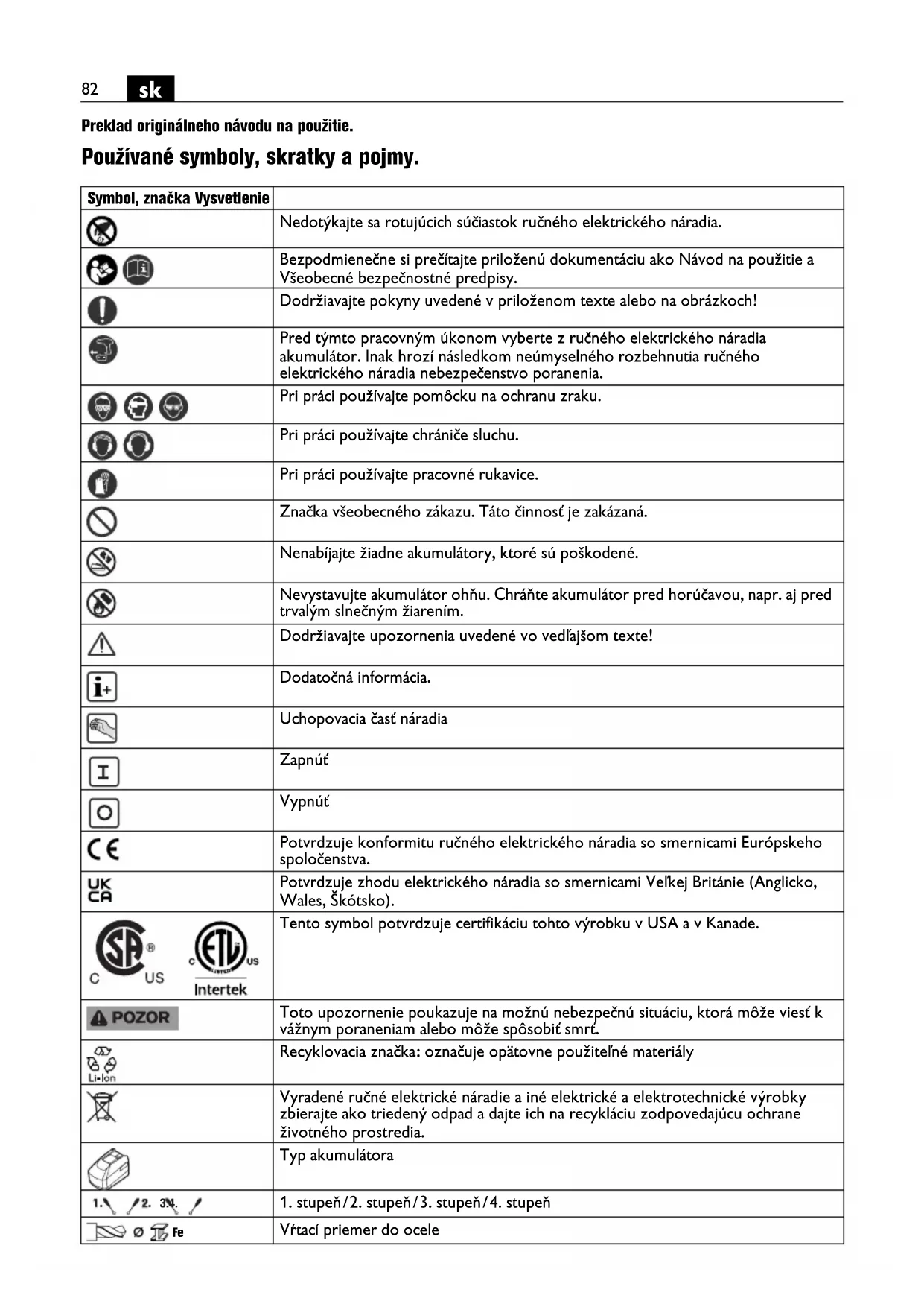 Preklad originálneho návodu na použitie. Používané symboly, skratky a pojmy. Symbol, značka Vysvetlenie Nedotýkajte sa rotujúcich súčiastok ručného elektrického náradia. Bezpodmienečne si prečítajte priloženú dokumentáciu ako Návod na použitie a Všeobecné bezpečnostné predpisy. Dodržiavajte pokyny uvedené v priloženom texte alebo na obrázkoch! Pred týmto pracovným úkonom vyberte z ručného elektrického náradia akumulátor. Inak hrozí následkom neúmyselného rozbehnutia ručného elektrického náradia nebezpečenstvo poranenia. Pri práci používajte pomôcku na ochranu zraku. Pri práci používajte chrániče sluchu. Pri práci používajte pracovné rukavice. Značka všeobecného zákazu. Táto činnosť je zakázaná. Nenabíjajte žiadne akumulátory, ktoré sú poškodené. Nevystavujte akumulátor ohňu. Chráňte akumulátor pred horúčavou, napr. aj pred trvalým slnečným žiarením. Dodržiavajte upozornenia uvedené vo vedľajšom texte! Dodatočná informácia. Uchopovacia časť náradia Zapnúť Vypnúť Potvrdzuje konformitu ručného elektrického náradia so smernicami Európskeho spoločenstva. Potvrdzuje zhodu elektrického náradia so smernicami Veľkej Británie (Anglicko, Wales, Škótsko). Tento symbol potvrdzuje certifikáciu tohto výrobku v USA a v Kanade. Toto upozornenie poukazuje na možnú nebezpečnú situáciu, ktorá môže viesť k vážnym poraneniam alebo môže spôsobiť smrť. Recyklovacia značka: označuje opätovne použiteľné materiály Vyradené ručné elektrické náradie a iné elektrické a elektrotechnické výrobky zbierajte ako triedený odpad a dajte ich na recykláciu zodpovedajúcu ochrane životného prostredia. Typ akumulátora