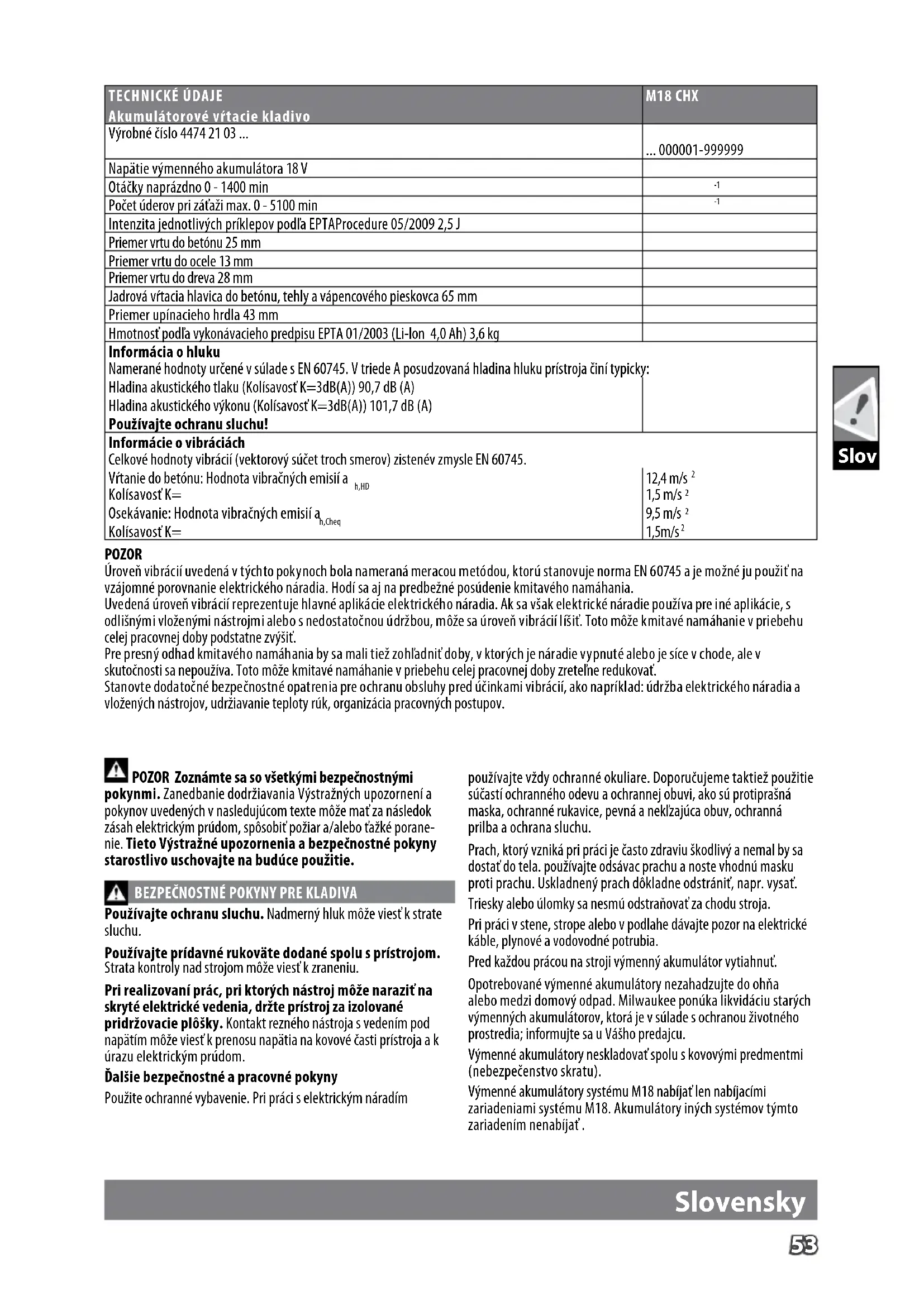 AKU-vŕtacie kladivo je univerzálne použiteľné na sekanie do kameňa a na vŕtanie do dreva, kovu a plastu nezávisle od sieťovej prípojky. CE - VYHLÁSENIE KONFORMITYCE - VYHLÁSENIE KONFORMITY Na našu výhradnú zodpovednosť vyhlasujeme, že produkt popísaný v časti „Technické údaje“ spĺňa všetky príslušné ustanovenia smerníc 2011/65/EÚ (RoHS), 2006/42/ES, 2014/30/EÚ aboli použité nasledovné harmonizované normy EN 60745-1:2009 + A11:2010 EN 60745-2-6:2010 EN 55014-1:2006 + A1:2009 + A2:2011 EN 55014-2:2015 EN 50581:2012 Winnenden, 2017-11-30 Alexander Krug / Managing Director Splnomocnený zostaviť technické podklady. Techtronic Industries GmbH Max-Eyth-Straße 10, 71364 Winnenden, Germany AKUMULÁTORY Dlhší čas nepoužívané výmenné akumulátory pred použitím dobiť. Teplota vyššia ako 50°C znižuje výkon výmenného akumulátora. Zabráňte dlhšiemu ohriatiu slnkom alebo kúrením. Pripájacie kontakty na nabíjacom zariadení a výmennom akumulá- tore udržovať čisté. Pre optimálnu životnosť je nutné akumulátory po použití plne dobiť. K zabezpečeniu dlhej životnosti by sa akumulátory mali po nabití vybrať z nabíjačky. Pri skladovaní akumulátora po dobu dlhšiu než 30 dní: Skladujte akumulátor v suchu pri cca 27°C. Skladujte akumulátor pri cca 30%-50% nabíjacej kapacity. Opakujte nabíjanie akumulátora každých 6 mesiacov. OCHRANA PROTI PREŤAŽENIU AKUMULÁTORA Pri preťažení akumulátora príliš vysokým odberom prúdu, nap- ríklad pri extrémne vysokých točivých momentoch, pri blokovaní vrtáka, náhlom zastavení alebo skrate, začne vŕtačka na 2 sekundy hučať a potom sa samočinne vypne. K opätovnému zapnutiu uvoľnite spínacie tlačidlo a potom ho opäť zapnite. Pri extrémnom zaťažení sa akumulátor môže silne zahriať. Ak k tomu dôjde, akumulátor sa vypne. Akumulátor v tomto prípade k dobitiu a aktivácii vložte opäť do nabíjačky. PREPRAVA LÍTIOVO-IÓNOVÝCH BATÉRIÍ Lítiovo-iónové batérie podľa zákonných ustanovení spadajú pod prepravu nebezpečného nákladu. Preprava týchto batérií sa musí realizovať s dodržiavaním lokálnych, vnútroštátnych a medzinárodných predpisov a ustanovení. Spotrebitelia môžu tieto batérie bez problémov prepravovať po cestách. Komerčná preprava lítiovo-iónových batérií prostredníctvom špedičných riem podlieha ustanoveniam o preprave nebezpečného nákladu. Prípravu k vyexpedovaniu a samotnú prepravu smú vykonávať iba adekvátne vyškolené osoby. Na celý proces sa musí odborne dohliadať. Pri preprave batérií treba dodržiavať nasledovné: Zabezpečte, aby boli kontakty chránené a izolované, aby sa zamedzilo skratom. Dávajte pozor na to, aby sa zväzok batérií v rámci balenia nemohol zošmyknúť. Poškodené a vytečené batérie sa nesmú prepravovať. Kvôli ďalším informáciám sa obráťte na vašu špedičnú rmu.55 ÚDRZBA Vetracie otvory udržovať stale v čistote. Pri opotrebovaných uhlíkových kefách by sa mala vykonať okrem výmeny uhlíkových kief v zákaznickom centre aj prehliadka príst- roja. Toto predlžuje životnosť prístroja a zaručuje stálu funkčnosť. Použivať len Milwaukee príslušenstvo a Milwaukee náhradné diely. Súčiastky bez návodu na výmenu treba dat vymeniť v jednom z Milwaukee zákazníckych centier (viď brožúru Záruka/Adresy zákazníckych centier). Pri udani typu stroja a čísla nachádzajúceho sa na štítku dá sa v prípade potreby vyžiadat explozívna schéma prístroja od vášho zákazníckeho centra alebo priamo v Techtronic Industries GmbH, Max-Eyth-Straße10, 71364Winnenden, Germany. SYMBOLY Pred prvým použitím prístroja si pozorne prečítajte návod na obsluhu. POZOR! NEBEZPEČENSTVO! Pred každou prácou na stroji výmenný akumulátor vytiahnuť. Príslušenstvo - nie je súčasťou štandardnej výbavy, odporúčané doplnenie z programu príslušenstva. Elektrické zariadenia, batérie/akumulátory sa nesmú likvidovať spolu s odpadom z domácností. Elektrické zariadenia, batérie/akumulátory treba zbierať oddelene a odovzdať ich v recyklačnom podniku na ekologickú likvidá- ciu. Na miestnych úradoch alebo u vášho špecializovaného predajcu sa spýtajte na recyklačné podniky a zberné dvory. Značka CE UkrSEPRO značka zhody Euroázijská značka zhody Slovensky Slov56 Pol Polski DANE TECHNICZNE Młotkowiertarka akumulatorowa M18 CHX Numer produkcyjny 4474 21 03 ... ... 000001-999999 Napięcie baterii akumulatorowej 18 V Prędkość bez obciążenia 0 - 1400 min