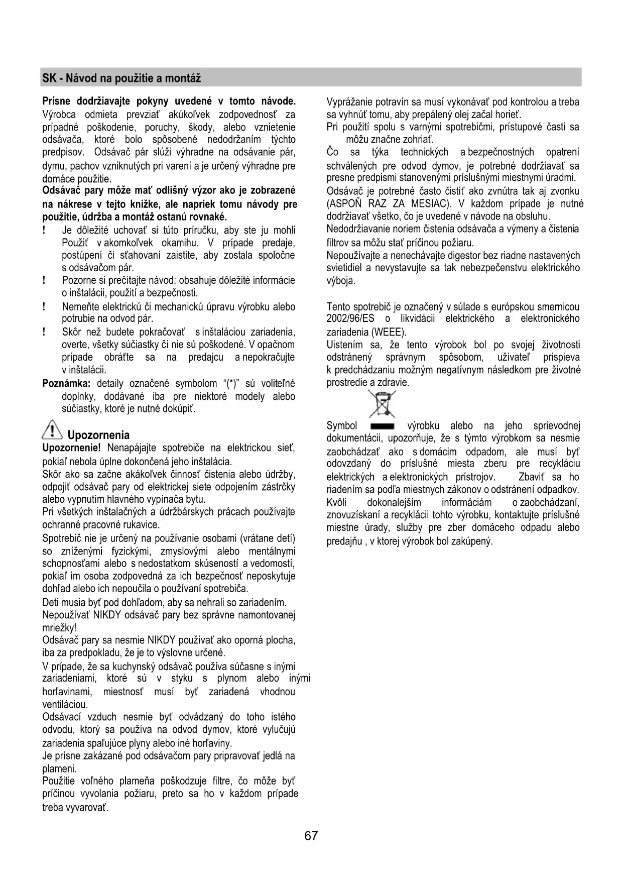 Jestliže osvětlení nefunguje, dříve než zavoláte servis si ověřte, zda jste správně nasadili žárovky do uložení. - Model s LED svítidly Digestoř je vybavena osvětlovacím systémem založeným na technologii DIOD. DIODY zaručují optimální osvětlení, s trvanlivostí až 10 krát delší než tradiční svídtila a umožňují úspory 90% elektrické energie. Pro výměny se obraťte na servisní službu.67 SK - Návod na použitie a montáž Prísne dodržiavajte pokyny uvedené v tomto návode. Výrobca odmieta prevziať akúkoľvek zodpovednosť za prípadné poškodenie, poruchy, škody, alebo vznietenie odsávača, ktoré bolo spôsobené nedodržaním týchto predpisov. Odsávač pár slúži výhradne na odsávanie pár, dymu, pachov vzniknutých pri varení a je určený výhradne pre domáce použitie. Odsávač pary môže mať odlišný výzor ako je zobrazené na nákrese v tejto knižke, ale napriek tomu návody pre použitie, údržba a montáž ostanú rovnaké. ! Je dôležité uchovať si túto príručku, aby ste ju mohli Použiť v akomkoľvek okamihu. V prípade predaje, postúpení či sťahovaní zaistite, aby zostala spoločne s odsávačom pár. ! Pozorne si prečítajte návod: obsahuje dôležité informácie o inštalácii, použití a bezpečnosti. ! Nemeňte elektrickú či mechanickú úpravu výrobku alebo potrubie na odvod pár. ! Skôr než budete pokračovať s inštaláciou zariadenia, overte, všetky súčiastky či nie sú poškodené. V opačnom prípade obráťte sa na predajcu a nepokračujte v inštalácii. Poznámka: detaily označené symbolom “(*)” sú voliteľné doplnky, dodávané iba pre niektoré modely alebo súčiastky, ktoré je nutné dokúpiť. Upozornenia Upozornenie! Nenapájajte spotrebiče na elektrickou sieť, pokiaľ nebola úplne dokončená jeho inštalácia. Skôr ako sa začne akákoľvek činnosť čistenia alebo údržby, odpojiť odsávač pary od elektrickej siete odpojením zástrčky alebo vypnutím hlavného vypínača bytu. Pri všetkých inštalačných a údržbárskych prácach používajte ochranné pracovné rukavice. Spotrebič nie je určený na používanie osobami (vrátane detí) so zníženými fyzickými, zmyslovými alebo mentálnymi schopnosťami alebo s nedostatkom skúseností a vedomostí, pokiaľ im osoba zodpovedná za ich bezpečnosť neposkytuje dohľad alebo ich nepoučila o používaní spotrebiča. Deti musia byť pod dohľadom, aby sa nehrali so zariadením. Nepoužívať NIKDY odsávač pary bez správne namontovanej mriežky! Odsávač pary sa nesmie NIKDY používať ako oporná plocha, iba za predpokladu, že je to výslovne určené. V prípade, že sa kuchynský odsávač používa súčasne s inými zariadeniami, ktoré sú v styku s plynom alebo inými horľavinami, miestnosť musí byť zariadená vhodnou ventiláciou. Odsávací vzduch nesmie byť odvádzaný do toho istého odvodu, ktorý sa používa na odvod dymov, ktoré vylučujú zariadenia spaľujúce plyny alebo iné horľaviny. Je prísne zakázané pod odsávačom pary pripravovať jedlá na plameni. Použitie voľného plameňa poškodzuje filtre, čo môže byť príčinou vyvolania požiaru, preto sa ho v každom prípade treba vyvarovať. Vyprážanie potravín sa musí vykonávať pod kontrolou a treba sa vyhnúť tomu, aby prepálený olej začal horieť. Pri použití spolu s varnými spotrebičmi, prístupové časti sa môžu značne zohriať. Čo sa týka technických a bezpečnostných opatrení schválených pre odvod dymov, je potrebné dodržiavať sa presne predpismi stanovenými príslušnými miestnymi úradmi. Odsávač je potrebné často čistiť ako zvnútra tak aj zvonku (ASPOŇ RAZ ZA MESIAC). V každom prípade je nutné dodržiavať všetko, čo je uvedené v návode na obsluhu. Nedodržiavanie noriem čistenia odsávača a výmeny a čistenia filtrov sa môžu stať príčinou požiaru. Nepoužívajte a nenechávajte digestor bez riadne nastavených svietidiel a nevystavujte sa tak nebezpečenstvu elektrického výboja. Tento spotrebič je označený v súlade s európskou smernicou 2002/96/ES o likvidácii elektrického a elektronického zariadenia (WEEE). Uistením sa, že tento výrobok bol po svojej životnosti odstránený správnym spôsobom, užívateľ prispieva k predchádzaniu možným negatívnym následkom pre životné prostredie a zdravie. Symbol výrobku alebo na jeho sprievodnej dokumentácii, upozorňuje, že s týmto výrobkom sa nesmie zaobchádzať ako s domácim odpadom, ale musí byť odovzdaný do príslušné miesta zberu pre recykláciu elektrických a elektronických prístrojov. Zbaviť sa ho riadením sa podľa miestnych zákonov o odstránení odpadkov. Kvôli dokonalejším informáciám o zaobchádzaní, znovuzískaní a recyklácii tohto výrobku, kontaktujte príslušné miestne úrady, služby pre zber domáceho odpadu alebo predajňu , v ktorej výrobok bol zakúpený.68 Používanie Digestor je možné použiť s odsávaním mimo miestnosť, alebo s recirkulačným filtrom pre čistenie vzduchu v miestnosti. Odsávacia verzia Výpary sú vypúšťané von prostredníctvom výfukového potrubia upevneného na spojovacej prírube. Priemer výfukového potrubia sa musí zhodovať s priemerom spojovacieho prstenca. Upozornenie! Odťahové potrubie nie je súčasťou výbavy a je nutné ho zakúpiť. Na vodorovnej (horizontálnej) časti, potrubie musí mať mierny náklon smerom nahor (približne 10°), aby sa vzduch mohol ľahšie odvádzať smerom von. Ak odsávač pary je vybavený uhlíkovými filtrami, tak tie musia byť vybraté. Napojte digestor na odťahové potrubie s rovnakým priemerom ako vývod vzduchu (spojovacia príruba). Použitie odvodových trubíc a otvorov do steny s menším priemerom má za následok zníženie odsávadsej výkonnosti e drastické zvýšenie hlučnosti. V tejto zásluhe sa vyhýba každej zodpovednost