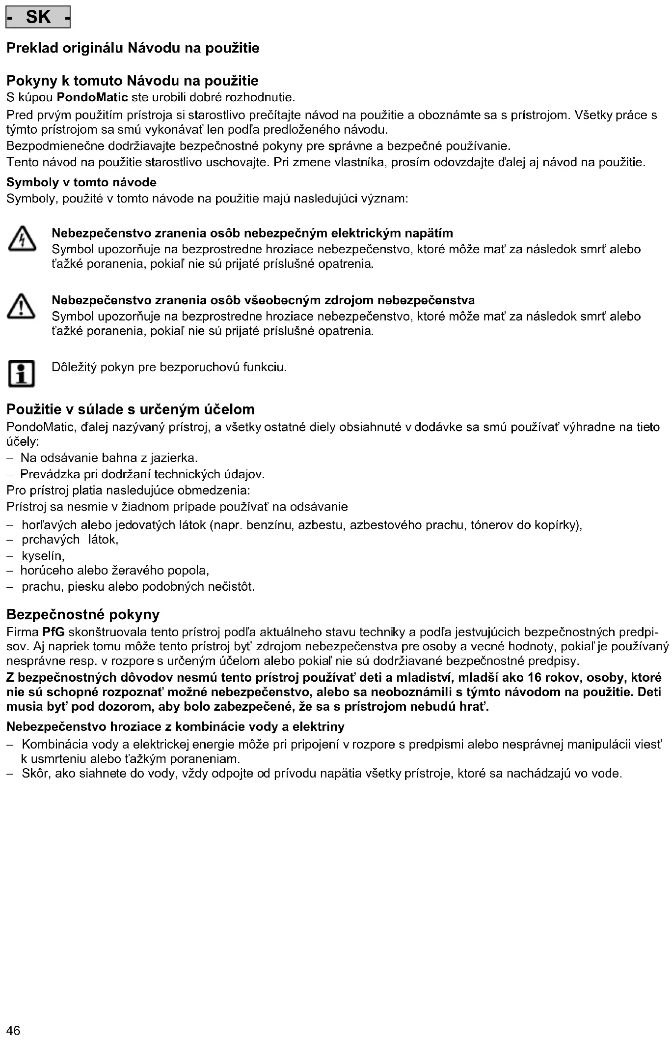 Firma PfG skonstruova tento pristroj podla aktualneho stavu techniky a podla jestvujucich bezpečnostnych predpisov. Aj napriek tomu moze tento pristroj byt' zdrojom nebezpečenstva pre osoby a vecné hodnoty, pokial je použivaný nesprávné resp. v rozpore s urcenym učelom aleboPokial' nie su dodržiavané bezpečnostné predpisy.