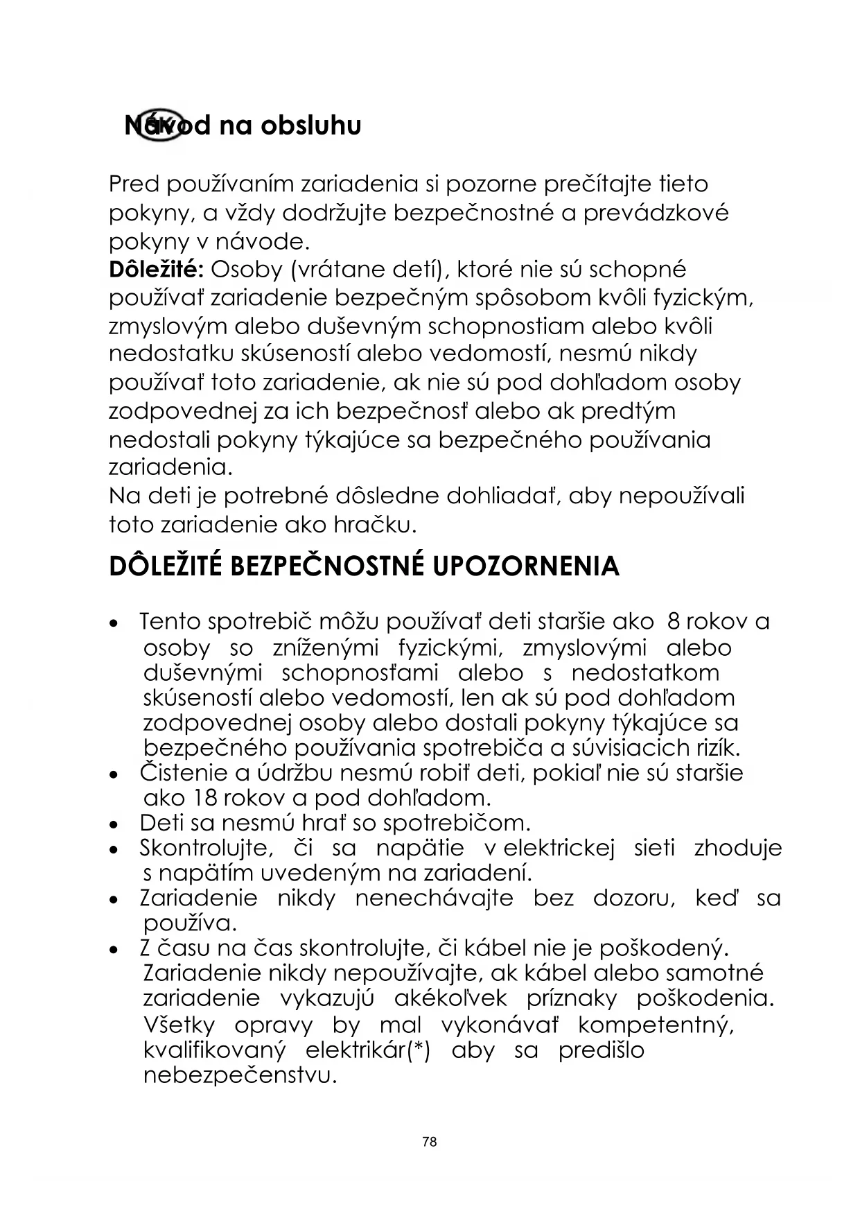 Tento spotrebič môžu používať deti staršie ako 8 rokov a osoby so zníženými fyzickými, zmyslovými alebo duševnými schopnosťami alebo s nedostatkom skúseností alebo vedomostí, len ak sú pod dohľadom zodpovednej osoby alebo dostali pokyny týkajúce sa bezpečného používania spotrebiča a súvisiacich rizík. Čistenie a údržbu nesmú robiť deti, pokiaľ nie sú staršie ako 18 rokov a pod dohľadom. Deti sa nesmú hrať so spotrebičom. Skontrolujte, či sa napätie v elektrickej sieti zhoduje s napätím uvedeným na zariadení. Zariadenie nikdy nenechávajte bez dozoru, keď sa používa. Z času na čas skontrolujte, či kábel nie je poškodený. Zariadenie nikdy nepoužívajte, ak kábel alebo samotné zariadenie vykazujú akékoľvek príznaky poškodenia.