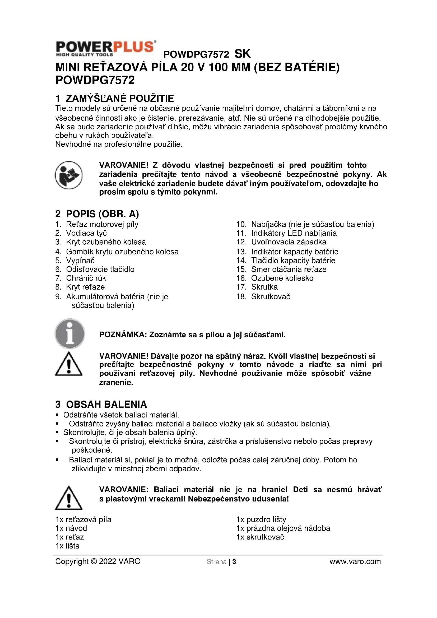 - Používateľ smie vymieňať len reťaz a vodiacu lištu. Vždy zabezpečte, aby ste súčasť vymenili za správny ekvivalent uvedený v špecifikáciách tohto návodu.POWDPG7572 SK Copyright © 2022 VARO Strana | 7 www.varo.com 7 DOPLNKOVÉ BEZPEČNOSTNÉ POKYNY PRE BATÉRIE