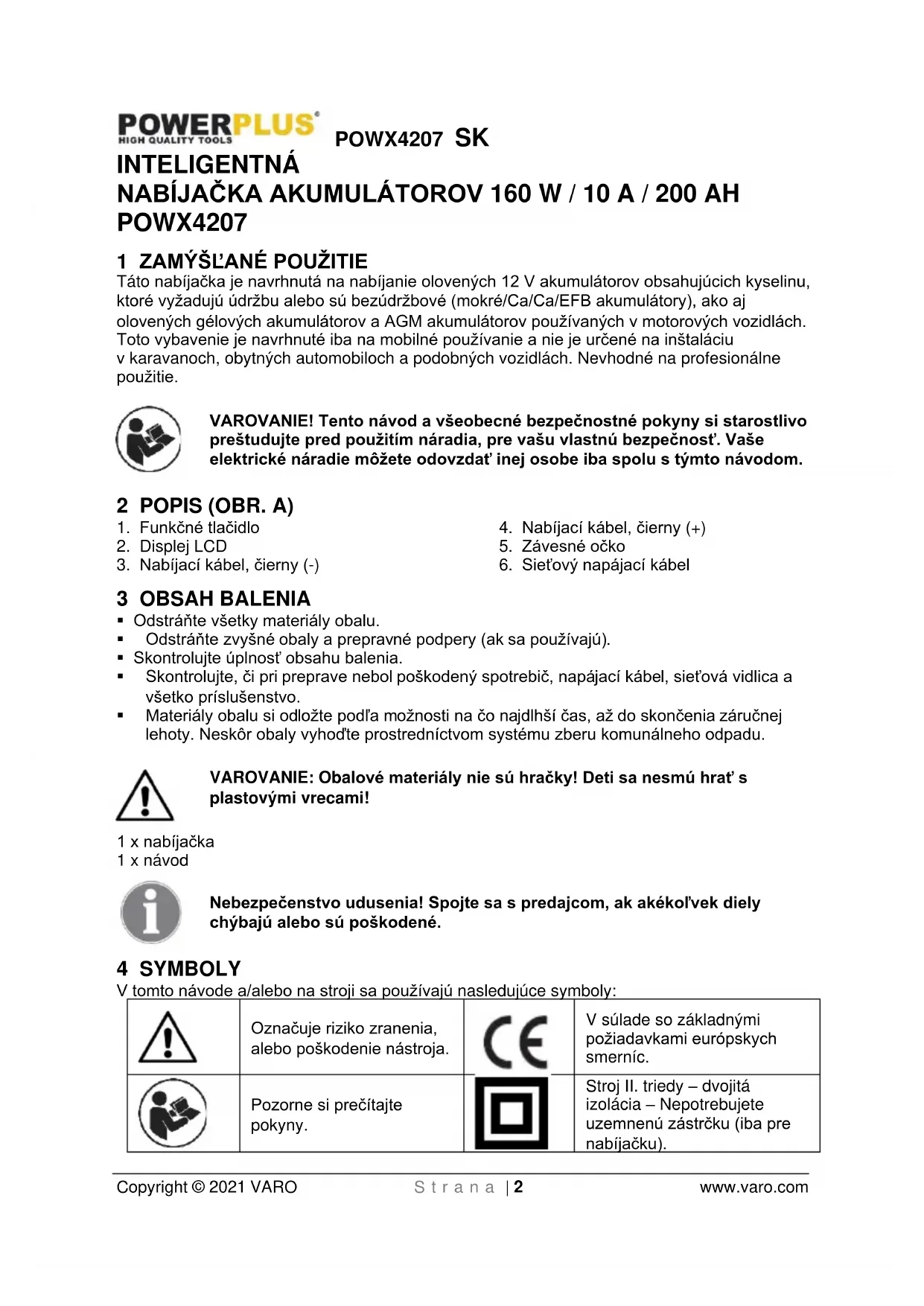 - Toto vybavenie nesmie byť použité na nabíjanie akumulátorov typu LiFe (lítium-železo- fosfát) ani iných lítiových nabíjacích akumulátorov.POWX4207 SK Copyright © 2021 VARO S t r a n a | 5 www.varo.com 7 PREVÁDZKA Pred pripojením vybavenia k napájaciemu zdroju sa uistite, že sú údaje na štítku s technickými údajmi zhodné z napätím zdroja. VAROVANIE: nenabíjajte zamrznuté akumulátory.