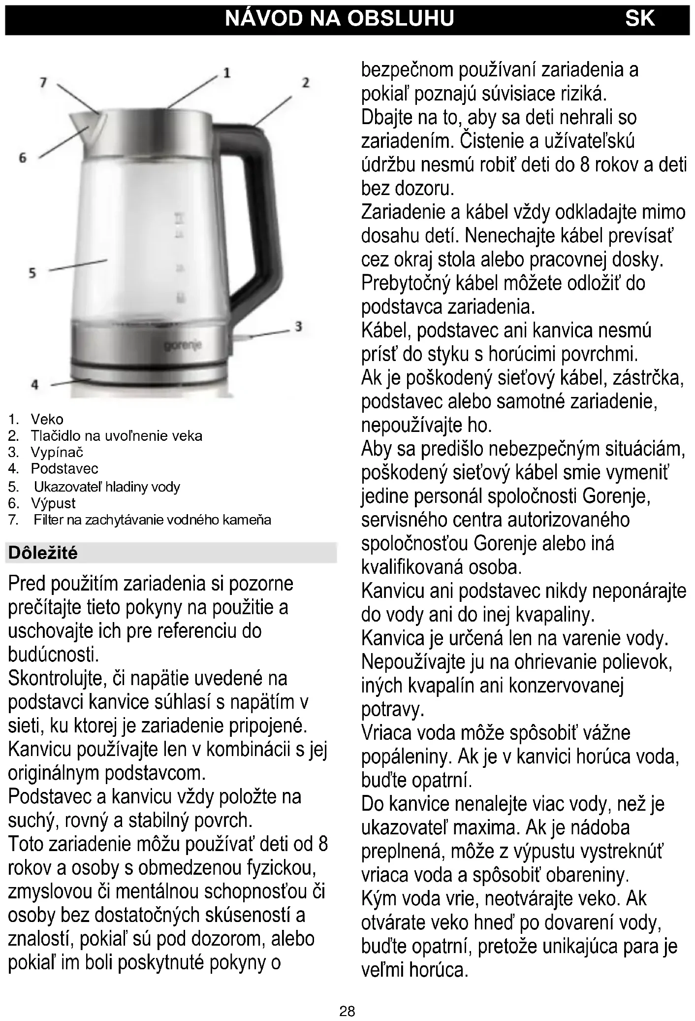 Dôležité Pred použitím zariadenia si pozorne prečítajte tieto pokyny na použitie a uschovajte ich pre referenciu do budúcnosti. Skontrolujte, či napätie uvedené na podstavci kanvice súhlasí s napätím v sieti, ku ktorej je zariadenie pripojené. Kanvicu používajte len v kombinácii s jej originálnym podstavcom. Podstavec a kanvicu vždy položte na suchý, rovný a stabilný povrch. Toto zariadenie môžu používať deti od 8 rokov a osoby s obmedzenou fyzickou, zmyslovou či mentálnou schopnosťou či osoby bez dostatočných skúseností a znalostí, pokiaľ sú pod dozorom, alebo pokiaľ im boli poskytnuté pokyny o bezpečnom používaní zariadenia a pokiaľ poznajú súvisiace riziká. Dbajte na to, aby sa deti nehrali so zariadením. Čistenie a užívateľskú údržbu nesmú robiť deti do 8 rokov a deti bez dozoru. Zariadenie a kábel vždy odkladajte mimo dosahu detí. Nenechajte kábel prevísať cez okraj stola alebo pracovnej dosky. Prebytočný kábel môžete odložiť do podstavca zariadenia. Kábel, podstavec ani kanvica nesmú prísť do styku s horúcimi povrchmi. Ak je poškodený sieťový kábel, zástrčka, podstavec alebo samotné zariadenie, nepoužívajte ho. Aby sa predišlo nebezpečným situáciám, poškodený sieťový kábel smie vymeniť jedine personál spoločnosti Gorenje, servisného centra autorizovaného spoločnosťou Gorenje alebo iná kvalifikovaná osoba. Kanvicu ani podstavec nikdy neponárajte do vody ani do inej kvapaliny. Kanvica je určená len na varenie vody. Nepoužívajte ju na ohrievanie polievok, iných kvapalín ani konzervovanej potravy. Vriaca voda môže spôsobiť vážne popáleniny. Ak je v kanvici horúca voda, buďte opatrní. Do kanvice nenalejte viac vody, než je ukazovateľ maxima. Ak je nádoba preplnená, môže z výpustu vystreknúť vriaca voda a spôsobiť obareniny. Kým voda vrie, neotvárajte veko. Ak otvárate veko hneď po dovarení vody, buďte opatrní, pretože unikajúca para je veľmi horúca.29 Nedotýkajte sa tela kanvice, pretože sa pri používaní veľmi zohreje. Kanvicu vždy dvíhajte za jej rúčku. Aby ste zabránili vyvretiu vody z kanvice, vždy sa uistite, že voda v kanvici pokrýva aspoň jej dno. Môže sa stať, že sa na podstavci varnej kanvice objaví skondenzovaná para. Je to bežný jav a neznamená to, že varná kanvica je poškodená. V závislosti od tvrdosti vody, ktorú používate, sa môžu na povrchu ohrevného telesa Vašej kanvice objaviť malé škvrny. Je to dôsledok postupnej tvorby vodného kameňa na povrchu ohrevného telesa a vnútorného povrchu kanvice. Čím je voda tvrdšia, tým rýchlejšie vznikajú usadeniny vodného kameňa. Usadeniny môžu mať rôznu farbu. Hoci je vodný kameň neškodný, veľké množstvo usadenín môže ovplyvniť výkon Vašej kanvice. Vodný kameň pravidelne odstraňujte podľa pokynov uvedených v časti „Odstraňovanie vodného kameňa“. Tento spotrebič je označený v súlade s európskou smernicou 2012/19/EU o nakladaní s použitými elektrickými a elektronickými zariadeniami (waste electrical and electronic equipment - WEEE). Táto smernica stanoví jednotný európsky (EU) rámec pre spätný odber a recyklovanie použitých zariadení. Elektromagnetické polia (EMF) Tento výrobok Gorenje vyhovuje všetkým normám týkajúcim sa elektromagnetických polí (EMF). Ak budete zariadenie používať správne a v súlade s pokynmi v tomto návode na použitie, bude jeho použitie bezpečné podľa všetkých v súčasnosti známych vedeckých poznatkov.